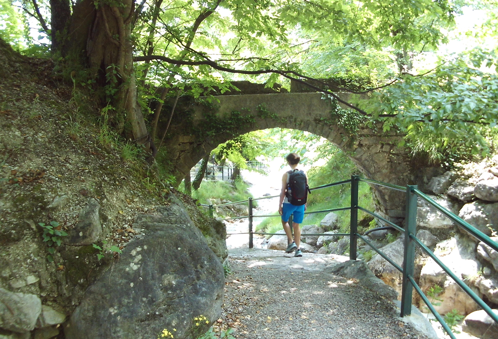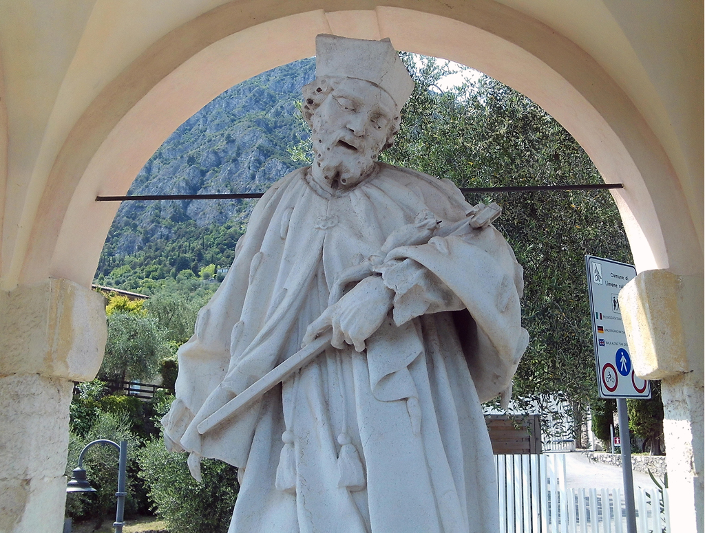 Wir wandern. Über die Brücke mit der Statue des heiligen Johannes am San-Giovanni-Bach entlang, vorbei an Oleander, Olivenbäumen, Hainbuchen, Eschen und Lorbeer hinauf bis zur Agriturismo-Herberge Milanesa. Auf dem Feldweg Via San Pietro durch das Tal Val di Pura zur gleichnamigen Kirche. Zu San Daniele Comboni und dessen Geburtshaus hoch oben gleich neben der Zitronenanlage, die von den Eltern des 2003 heiliggesprochenen Priesters, Afrika-Missionars und Ordensgründers damals noch selbst bearbeitet worden ist. Und schließlich über den kombinierten, etwa zweieinhalb Kilometer langen, 50 Meter über dem See im Fels fest verankerten Hänge-/Rad-/Fußweg von Limone fast bis nach Riva.
