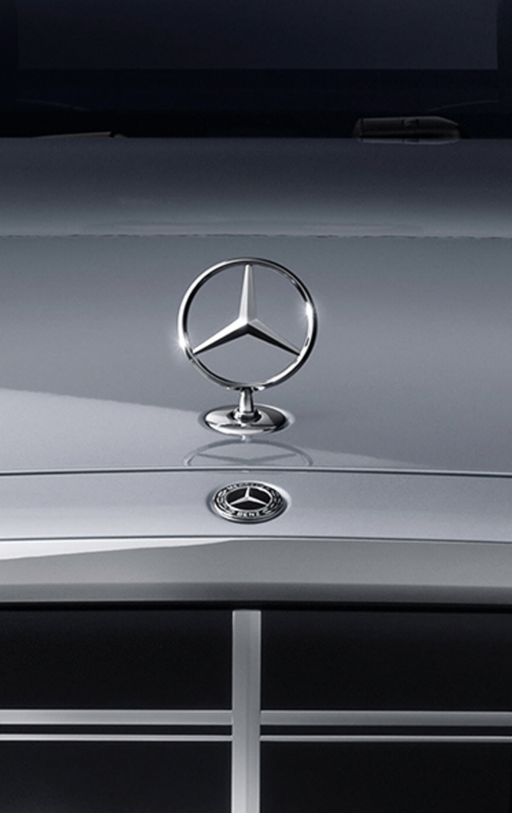 Blick auf die Frontpartie mit dem Markenstern vorn auf der Motorhaube über dem großen Kühlergrill.