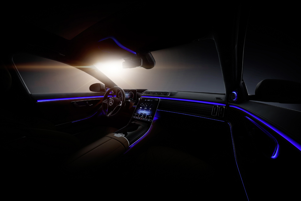 Blick ins Innere der S-Klasse mit aktiver Ambientebeleuchtung. Bis zu fünf Bildschirme sind an Bord.