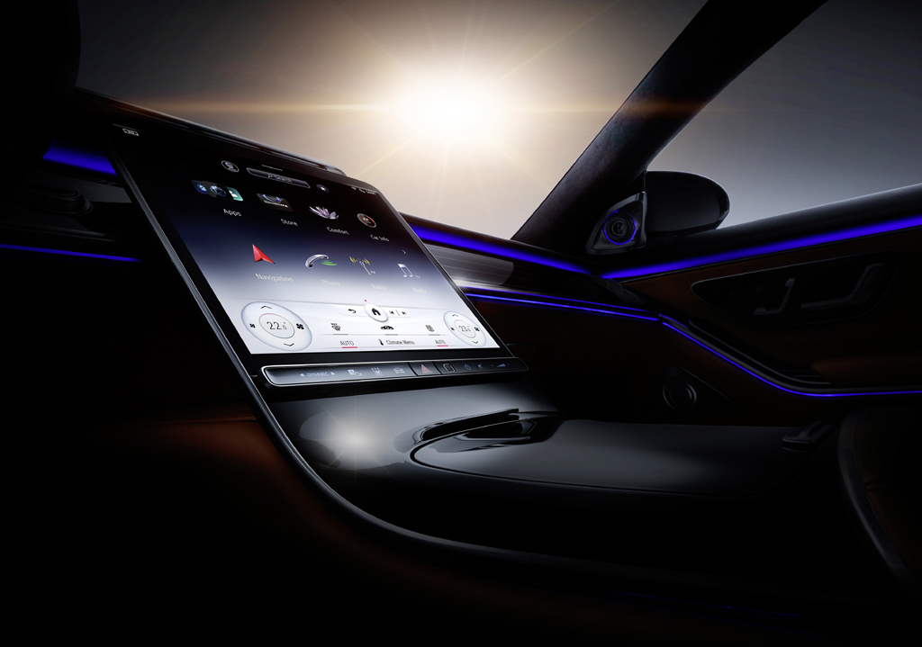Die S-Klasse kommt mit Hochleistungsscheinwerfern und erstmals versenkbaren Türgriffen daher. Der immer Lounge-ähnlichere Innenraum wird zunehmend zur Wohlfühloase. Im virtuellen Cockpit geht die Digitalisierung bis ins Detail. Es gibt kaum noch Knöpfe und Schalter. Egal ob Bedienung, Vernetzung, Navigation: Fast alles lässt sich auch per Sprache steuern, Stichwort „Hey, Mercedes!“ Bis zu fünf Bildschirme sind an Bord, der größte davon in der Mittelkonsole, brillant auflösend, mit erstaunlicher Grafik und höchster Rechengeschwindigkeit. Auch das Headup-Display mit passgenau über die Fahrbahn gelegten animierten Abbiegepfeilen ist überdimensional. Eine spezielle Assistenz soll sogar verschiedenste Bedienwünsche erkennen. Über 50 Elektronik-Komponenten sind per Funkschnittstelle „over the air“ aktualisierbar.