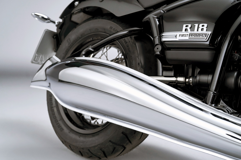 Bei dem Boxermotor der neuen R18 handelt es sich um ein luft-/ölgekühltes Zweizylinder-Viertakt-Aggregat mit genau 1802 Kubikzentimetern Hubraum. Es leistet 91 PS bei 4750 Umdrehungen pro Minute. Für Motorräder ziemlich gewaltige 158 Newtonmeter Drehmoment liegen bei 3000 Touren an. Ein Sechsgang-Getriebe überträgt die Kraft. Für Technik-Interessierte, was das Fahrwerk betrifft: Der Rahmen setzt sich aus einem Doppelschleifen-Stahlrohr, dazu aus einer Teleskopgabel vorn mit 12 Zentimetern Federweg, einem speziellen Federbein hinten mit einstellbarer Federbasis und 9 Zentimetern Federweg zusammen. Auf den 19-Zoll-Drahtspeichenrädern vorn sind serienmäßig 120er-Reifen aufgezogen, auf den 16-Zöllern hinten 180er. Doppelscheibenbremse vorn und Einscheibenbremse hinten messen 30 Zentimeter im Durchmesser. Der Radstand der 2,44 Meter langen, gut 96 Zentimeter breiten und 1,23 Meter hohen Maschine beträgt 1,73 Meter. Der Tank fasst 16 Liter. Man sitzt 69 Zentimeter hoch. Die unverkleidete R18 bringt leer unterm Strich 345 Kilo auf die Waage. Bereits der Motor ist 110 Kilo schwer. Zulässig sind laut Datenblatt 550 Kilo Gesamtgewicht.