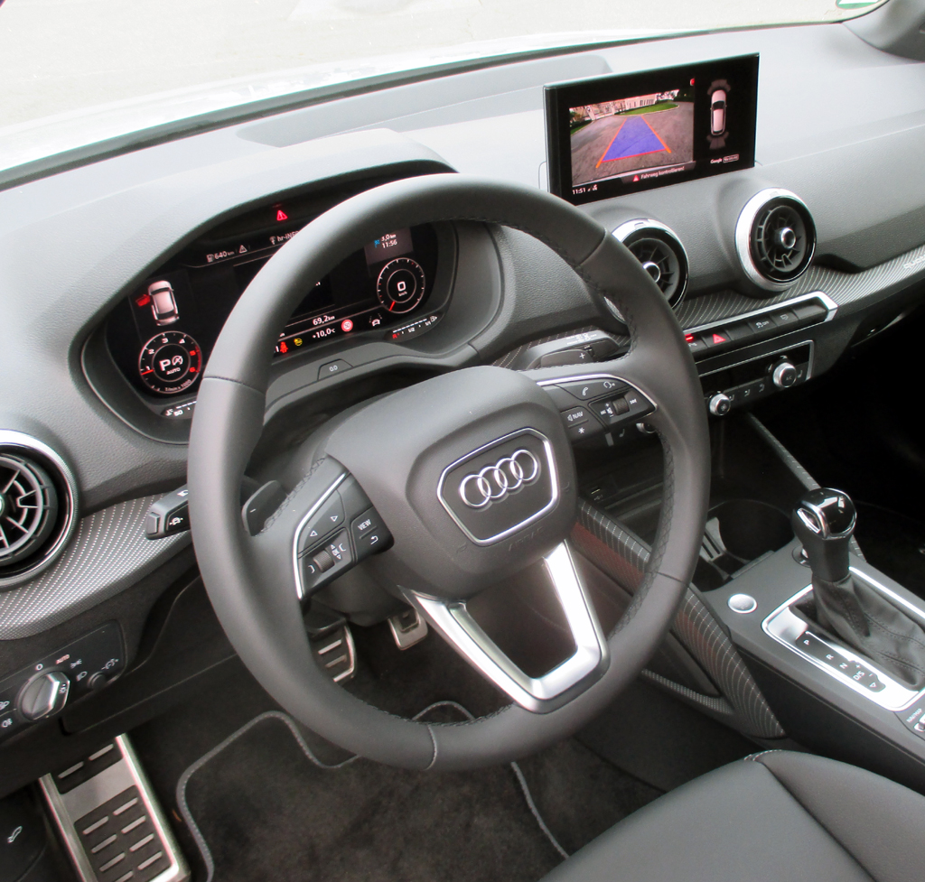 Das Fahren: Wir sind im handgeschalteten Benziner und im Diesel unterwegs gewesen, deren Bordcomputer bei uns am Ende nach normalen Orts-, Landstraßen- und längeren moderaten Autobahnfahrprofilen 6,9 (statt maximal 5,4) und 5,7 (statt maximal 4,8) Liter angezeigt haben. Der Q2 federt ausreichend bequem, kann fahrwerksmäßig aber auch durchaus sportlich punkten. So ist neben standfest zupackenden Bremsen etwa die zielgenaue Progressivlenkung Serie, die immer direkter arbeitet, je weiter man das Lenkrad einschlägt, so nicht nur für mehr Handlichkeit etwa beim Rangieren, sondern ebenfalls für mehr Agilität auf kurvenreichen Strecken sorgt. Das Sportfahrwerk legt die Karosserie tiefer. Antrieb, Lenkunterstützung und weitere Systeme sind wählbar in den Einstellungen Automatisch, Effizienz, Komfort, Dynamik oder Individual. Das Chassis mit Dämpferregelung deckt das Fahren vom strafferen Handling bis zum komfortableren Abrollen ab. In die Stabilisierungskontrolle ist ein Offroad-Modus integriert. Auch erlauben 20 Zentimeter Bodenfreiheit, im Gelände besser voranzukommen. Beim Allrad leitet die Elektronik das Motormoment bei Bedarf stufenlos auf die Hinterräder.