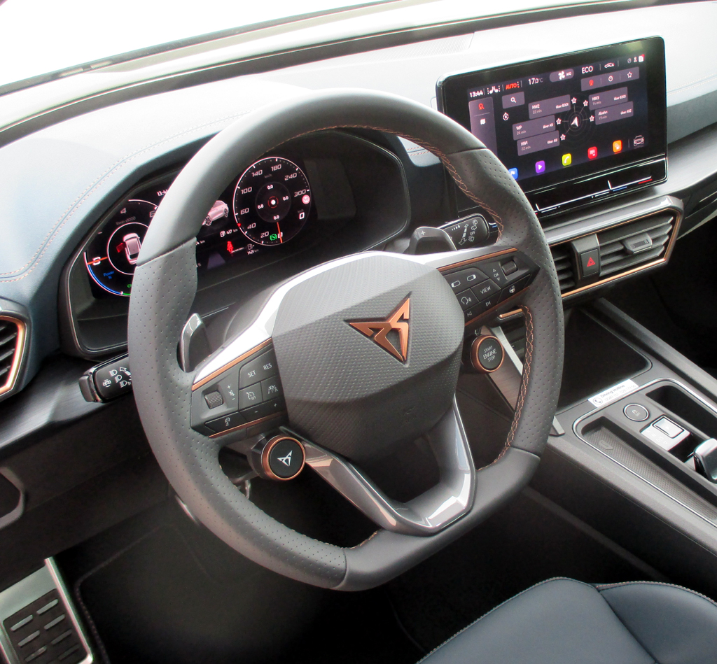 Das Fahren: Im Elektromodus geht’s jedes Mal los. Der Verbrenner schaltet sich erst zu, wenn der Ladestand der Batterie unter eine bestimmte Grenze fällt oder der Wagen über Tempo 130 fährt. Im Hybridmodus lässt sich der Einsatz des Elektroantriebs selber bestimmen, der Ladestand entweder halten oder die Batterie während der Fahrt aufladen, etwa um noch genug Strom später für eine Stadtfahrt vorzuhalten. Das Serien-Sportfahrwerk passt von seiner Abstimmung gut zur flotteren Kraftentfaltung, bietet dazu stets noch ordentlich Federungskomfort. Die progressivere Servolenkung gibt ausreichend Rückmeldung, unterstützt das agilere Unterwegssein etwa auf kurvenreicheren Fahrspaßstrecken. Mit Adaptivregelung reagiert das Chassis auf Änderungen beim Fahrverhalten und der Streckencharakteristik. Die vier Einstellungen Komfort, Sport, Cupra und – für gleich 15 verschiedene Abstufungen – Individual sind möglich. Der Allrad für den Kombi kann bestmögliche Antriebsmomente an die einzelnen Räder verteilen. Schon die normalen Scheibenbremsen packen standfest zu. Wer will, kann aber auch die auf noch höhere Leistung getrimmten sportlicheren ordern.