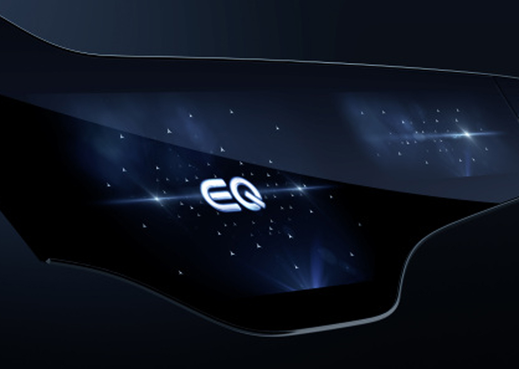 Der Bildschirm, nahezu einen Viertel Quadratmeter groß, fasst unter einer Glasplatte, in die zwei markante Lüftungsdüsen integriert sind, drei einzelne Bereiche zusammen: Der hinterm Lenkrad gibt die wichtigsten Fahrinformationen wieder. Der in der Mitte ist für Navigation und Bedienung der Klimatisierung da. Auf dem inhaltlich mit bis zu sieben Profilen individualisierbaren nur für den Beifahrer können Filme laufen oder Grafiken dargestellt werden, um so das Reisen angenehmer und unterhaltsamer zu gestalten. Vibrationsmotoren unterhalb der Bildschirmfläche geben haptische Rückmeldung. Die Bildgebung ist unabhängig von Blickwinkel und Lichtverhältnissen brillant. Alle Grafiken erscheinen in neuer Blau/Orange-Farbwelt. Die klassische Cockpitanzeige mit zwei Rundinstrumenten ist mit einem digitalen Laserschwert in einer Glaslinse versehen. Den einfacheren Anzeigestil macht Mercedes am Elektromodus mit räumlich sich bewegenden Spangen fürs Boosten oder Rückgewinnen von Energie deutlich, zwischen denen ein linsenförmiges Objekt der Schwerkraft folgt und die Kräfte angibt, die aufgrund starker Änderung von Größe und/oder Richtung der Geschwindigkeit auf den Wagen einwirken.