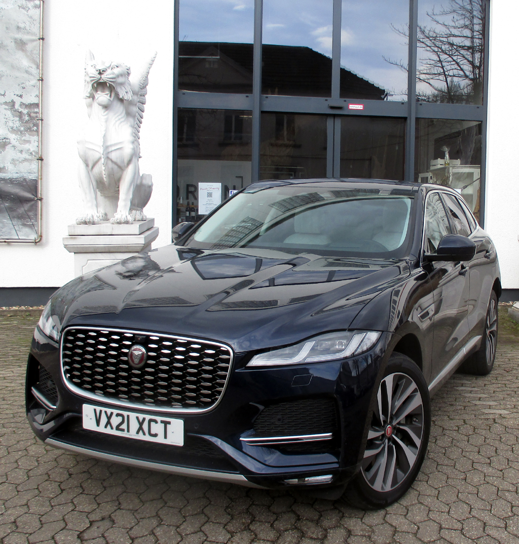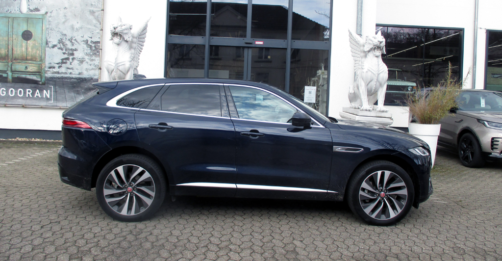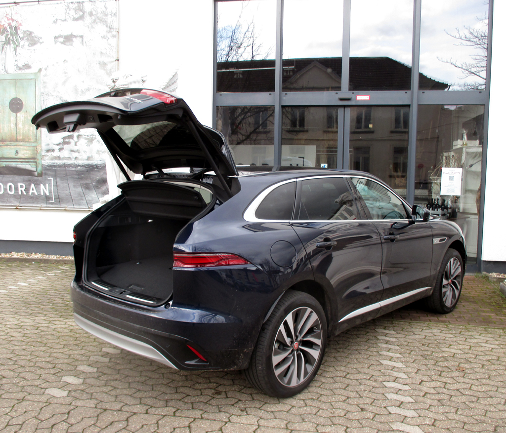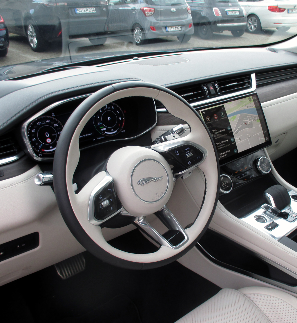 Das Fahren: Wir sind im Plug-in-Hybrid unterwegs gewesen, dessen Bordcomputer bei uns am Ende nach normalen Orts-, Landstraßen- und flotteren Autobahnfahrprofilen 4,9 Liter angezeigt hat. Die Laufkultur ist angenehm. Beim Tritt aufs Gaspedal schiebt der Wagen vehementer voran. Das durchaus sportlicher wirkende Fahrwerk mit stufenlos verstellbaren Dämpfern federt, gut für längere Strecken, dennoch ausreichend komfortabel. Der vollvariable Allrad, der mit der Traktion zugleich die Stabilität beim Fahren erhöht, leitet das Drehmoment auf trockener Straße nach hinten, droht Schlupf, auch nach vorn, beim Unter-/Übersteuern an die jeweilige Achse. Über den Dynamikmodus sind die Gaspedalannahme, das Adaptivfahrwerk, die Getriebeschaltzeiten und die elektromechanische Servolenkung, die noch etwas direktere Rückmeldung von der Straße geben könnte, individuell einstellbar. Auch der Wechsel in die Modi Normal, Winter oder Eco ist möglich. Der Plug-in-Hybrid kann Lasten bis 2,0 Tonnen ziehen, sonst 2,4. Die F-Pace bringen leer 1897 bis 2189 Kilo auf die Waage. Gut 21 Zentimeter Bodenfreiheit, Rampen-, Böschungswinkel und Wattiefe erlauben im Verbund mit dem Allrad ebenfalls Ausflüge ins Gelände. Die vorn nund hinten verbauten Scheibenbremsen packen standfest zu.