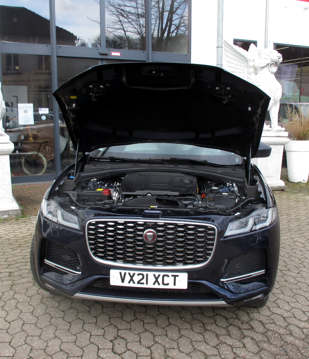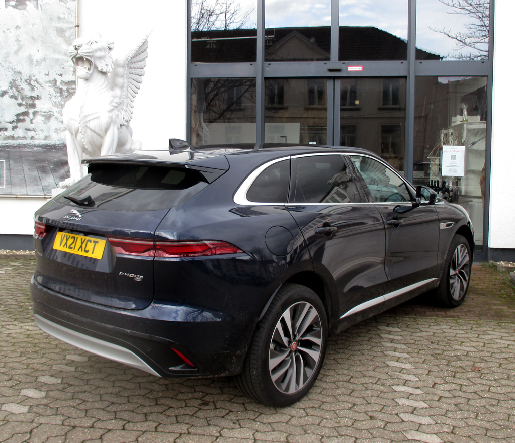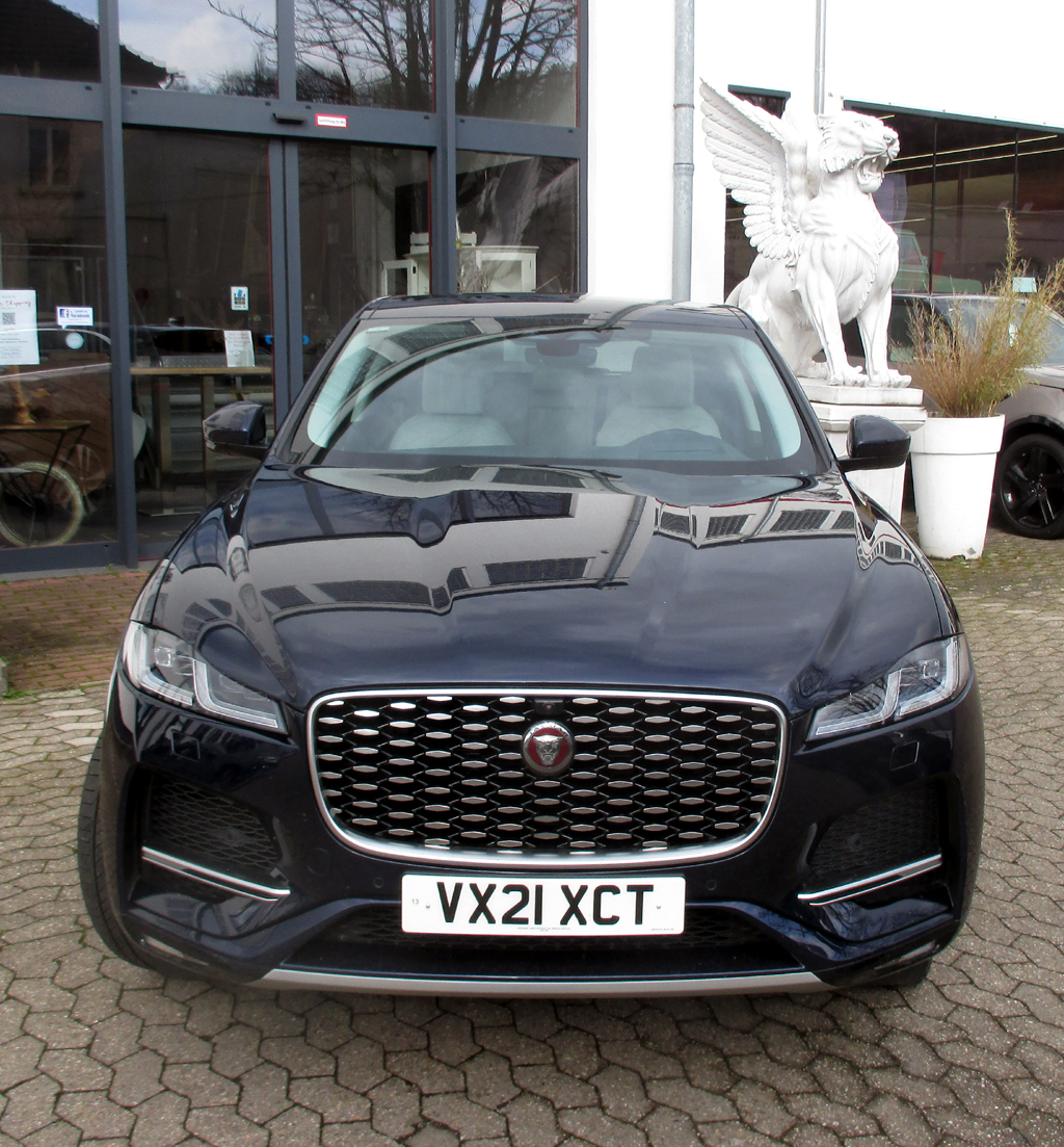 Das Fahren: Wir sind im Plug-in-Hybrid unterwegs gewesen, dessen Bordcomputer bei uns am Ende nach normalen Orts-, Landstraßen- und flotteren Autobahnfahrprofilen 4,9 Liter angezeigt hat. Die Laufkultur ist angenehm. Beim Tritt aufs Gaspedal schiebt der Wagen vehementer voran. Das durchaus sportlicher wirkende Fahrwerk mit stufenlos verstellbaren Dämpfern federt, gut für längere Strecken, dennoch ausreichend komfortabel. Der vollvariable Allrad, der mit der Traktion zugleich die Stabilität beim Fahren erhöht, leitet das Drehmoment auf trockener Straße nach hinten, droht Schlupf, auch nach vorn, beim Unter-/Übersteuern an die jeweilige Achse. Über den Dynamikmodus sind die Gaspedalannahme, das Adaptivfahrwerk, die Getriebeschaltzeiten und die elektromechanische Servolenkung, die noch etwas direktere Rückmeldung von der Straße geben könnte, individuell einstellbar. Auch der Wechsel in die Modi Normal, Winter oder Eco ist möglich. Der Plug-in-Hybrid kann Lasten bis 2,0 Tonnen ziehen, sonst 2,4. Die F-Pace bringen leer 1897 bis 2189 Kilo auf die Waage. Gut 21 Zentimeter Bodenfreiheit, Rampen-, Böschungswinkel und Wattiefe erlauben im Verbund mit dem Allrad ebenfalls Ausflüge ins Gelände. Die vorn nund hinten verbauten Scheibenbremsen packen standfest zu.