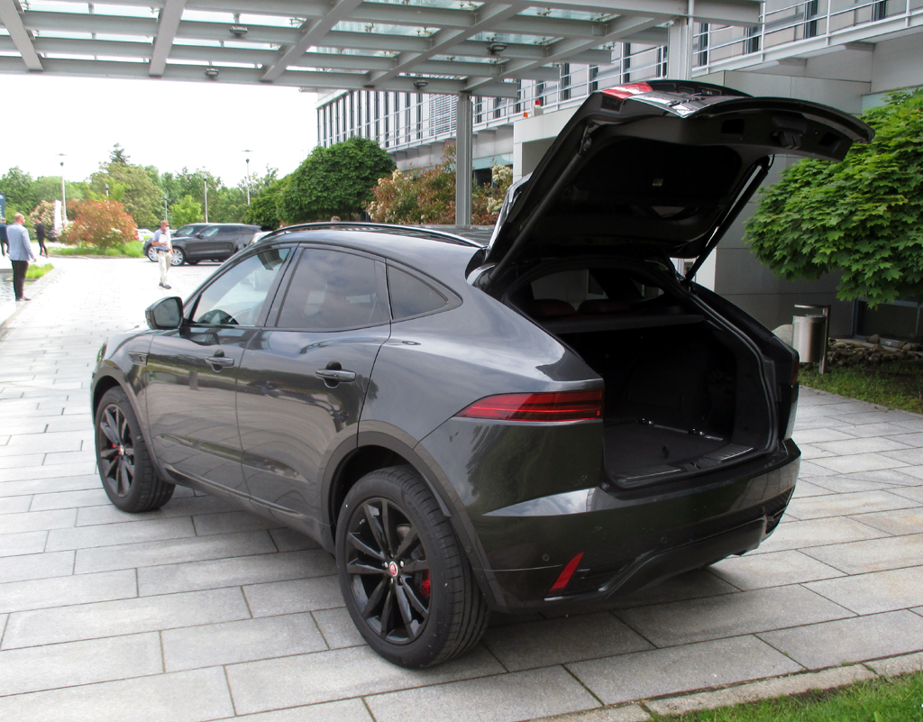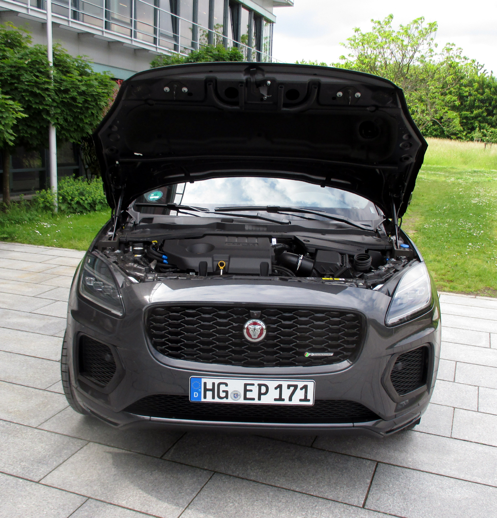 Das Fahren: Wir sind im Dreizylinder-Benziner mit Achtgang-Box unterwegs gewesen. Dessen Bordcomputer hat bei uns nach normalen Orts- und Landstraßenfahrprofilen im Taunus sowie einer kürzeren Autobahnetappe bei eher moderater und konstanter Fahrweise ohne größere Lastwechsel am Ende 7,4 (statt 6,8) Liter angezeigt. Der Turbo, Twin-Scroll-Lader mit zwei Strömungskanälen für mehr Leistung bei hohen Temperaturen, schiebt den E-Pace anfangs nicht ganz so leichtfüßig, dann aber doch recht bald schwungvoller voran. Das Fahrwerk mit Einzelradaufhängung, speziellen Federbeinen, Schraubenfedern und Stabilisator hinterlässt weiter einen genauso komfortablen wie sportlichen Eindruck. Die elektromechanische Servolenkung gibt direkte Rückmeldung. Die Scheibenbremsen packen standfest zu.