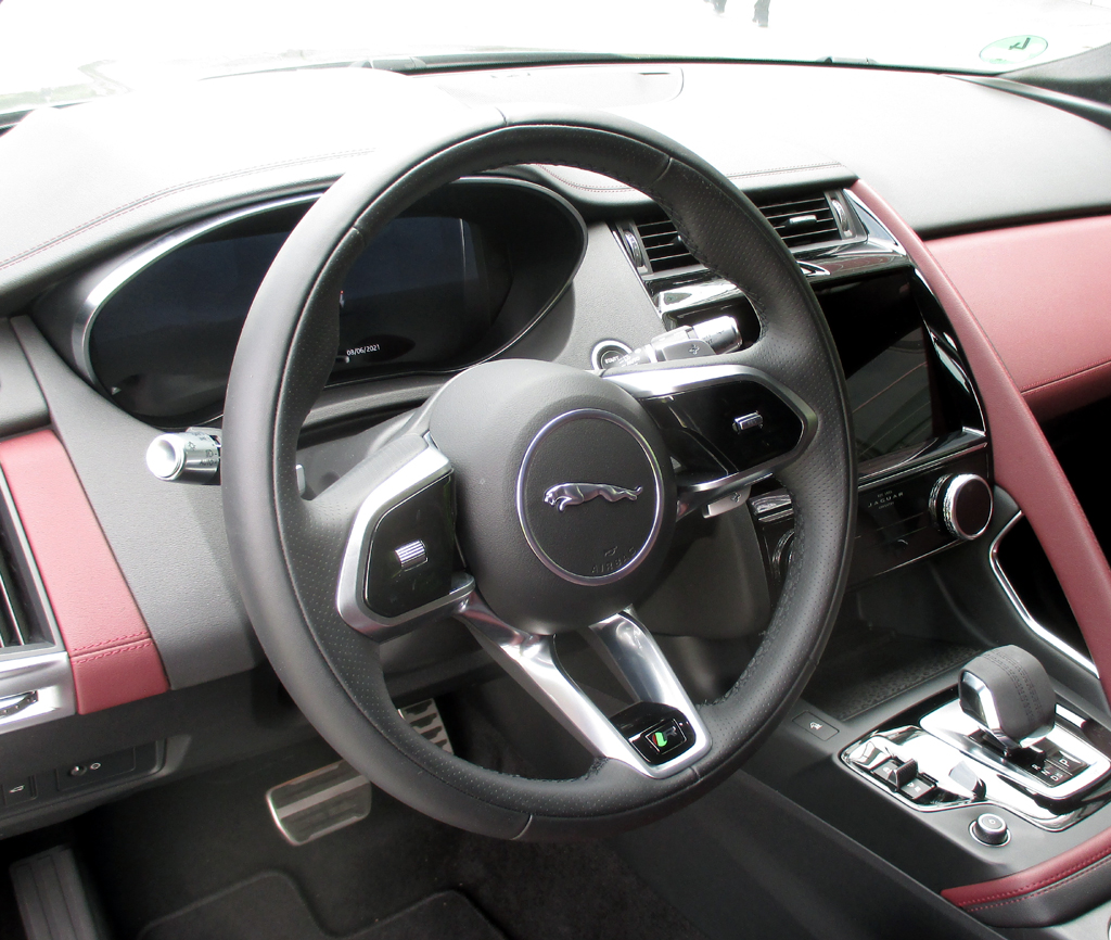 Das Auto: Den E-Pace gibt es bei uns seit 2018. Er läuft in Österreich bei Magna Steyr vom Band, baut auf der Plattform auf, auf der auch Range Rover Evoque und Discovery Sport der eigentlich eher auf Geländewagen spezialisierten Markenschwester Land Rover entstehen. Der fünftürige Fünfsitzer, sauber verarbeitet, insgesamt recht wertig anmutend, 4,39 Meter lang, 1,64 Meter hoch, 1,98/2,08 Meter breit, Radstand 2,68 Meter, ordentlich Platz selbst im Fond, Kofferraum 494 bis 1170 Liter, lehnt sich beim Design an den Sportwagen F-Type an. Man sitzt nur höher, hat alles besser im Blick. Das Interieur wirkt wertiger ausgearbeitet. Im weitgehend digitalen Cockpit ist auch die Bedienung deshalb jetzt rascher im Griff, weil sich das Infotainment samt Navigation mittlerweile wie bei Land Rover leichter handhaben lässt.