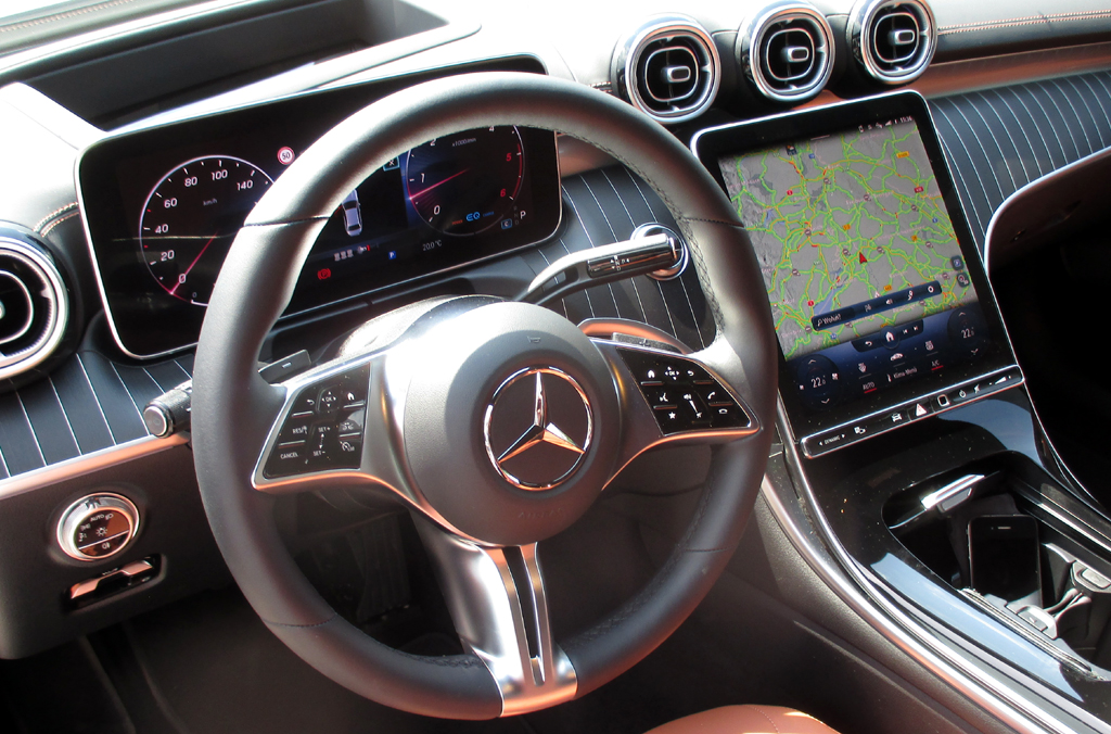 Die Ausstattung: Aus der Oberklasse stammen etwa der freistehende 10,25- oder 12,3-Zoll-Bildschirm hinterm Lenkrad, der 9,5- oder 11,9-Zoll-Hochformat-Touchscreen in der Mitte, das erweiterte lernfähige Multimediasystem, die aktive Komfortfunktion und der neue Airbag zwischen Fahrer und Beifahrer. Fahrer- und Zentraldisplay sind in drei Anzeigenstilen (klassisch, sportlich, dezent) und drei Programmen (Navigation, Assistenz, Service) individualisierbar. Die „Hey Mercedes“-Sprachhilfe ist schlauer gemacht. Mobile Assistenz lässt die C-Klasse aus der Ferne zur Schaltzentrale fürs eigene Zuhause, Stichwort „Smart Home“ werden. Über Musikstreaming sind Millionen von Songs aufrufbar. Die Software soll „over die air“ immer auf neuestem Stand sein. Optionen sind etwa Digitallicht oder die Kamera, die die Umgebung vor dem Wagen auf dem zentralen Display zeigt, auf dem sich auch virtuelle Objekte, Markierungen und Informationen einblenden. Die aktive Abstandsassistenz reagiert jetzt bis Tempo 100 auf stehende Fahrzeuge, die aktive Lenkassistenz erkennt die Spur noch besser über eine 360-Grad-Kamera, die Verkehrszeichenassistenz nimmt nun auch Schilderbrücken, Baustellen-Beschilderungen, Gebote wie „Bei Nässe“ wahr, verfügt über Stopp-Schild- und Rote-Ampel-Warnfunktion.