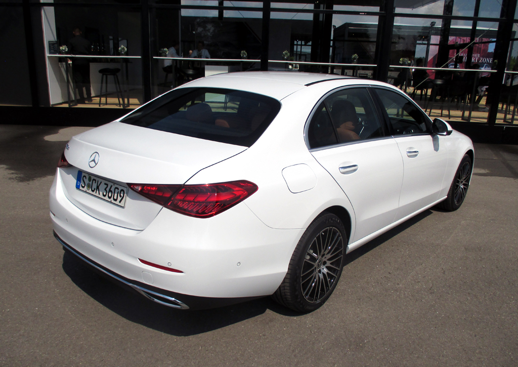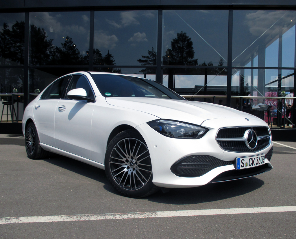 Das Auto: „Mit rund 10,5 Millionen verkauften Fahrzeugen ist die C-Klasse die erfolgreichste Baureihe von Mercedes-Benz“, sagt Produktmann Frederic Esselmann. Bei der aktuellen handelt es sich um die fünfte Generation seit 1993, seit die C-Klasse den „Baby-Benz“ Mercedes 190 abgelöst hat. Sie läuft in Bremen vom Band, hat – 4,75 Meter lang, 1,82 Meter breit, 1,43 Meter hoch, Radstand 2,86 Meter – in fast allen Abmessungen zugelegt, baut nur flacher. Vorn sind Schulter- und Ellbogenfreiheit größer, im Fond ist die Beinfreiheit gewachsen. In der Limousine lassen sich weiter 455, im Kombi mit 490 bis 1510 künftig 30 Liter mehr Gepäck verstauen. Vom kurzen Überhang vorn über die nach hinten gerückte Frontscheibe und Kabine bis hin zum ebenfalls flotteren Heck wirken außen schon die Proportionen dynamischer. Powerdomes auf der Motorhaube unterstreichen wie die bis zu 19 Zoll großen Räder den beinahe schon jugendlich-frischen, sportlich-präsenteren Charakter. Im wertigeren Inneren mit eleganten Linien und edel wirkenden Materialien sind Details aus der S-Klasse übernommen. Im überaus modernen Cockpit geht es nun weitgehend digital zu. Selbst den Dreh/Drück-Regler sucht man nunmehr vergebens. Die Produktbesonderheiten fasst Esselmann vom sportlicheren Äußeren über das futuristischere Innere, modernstes Multimedia, Digitallicht mit Projektionsfunktion, Multikontursitze und elektrifizierte Motoren bis hin zu den Elektronikhilfen zusammen, mit deren Hilfe man teilautomatisiert fahren.
