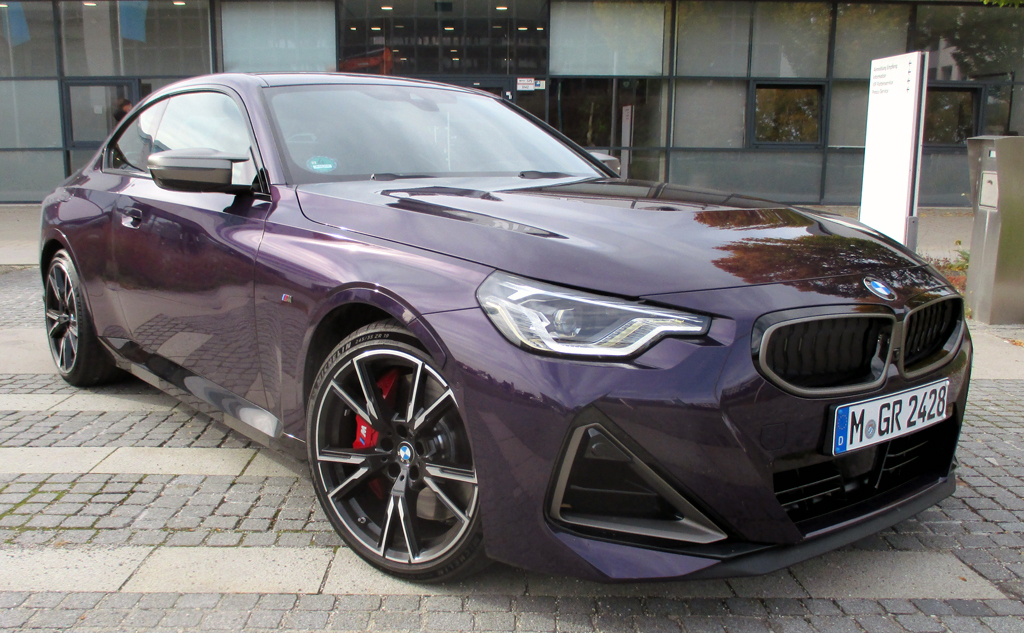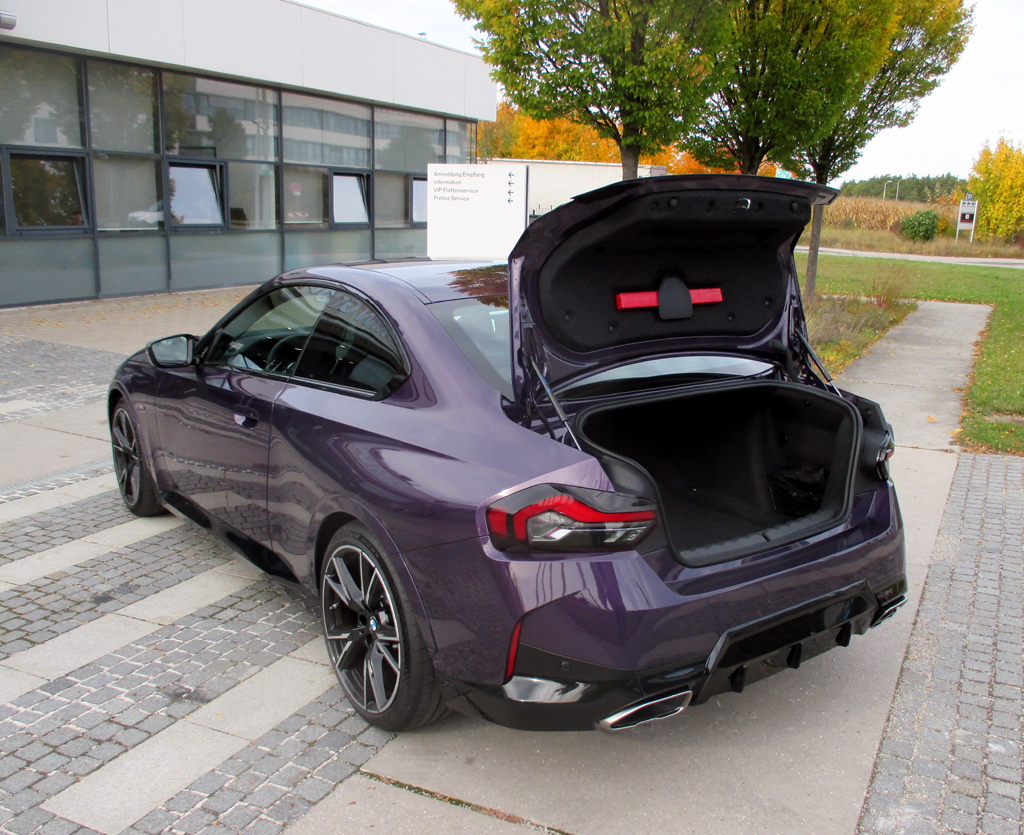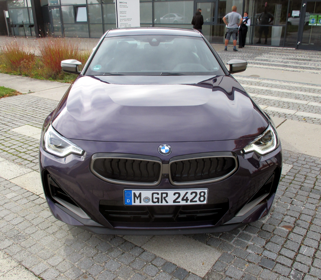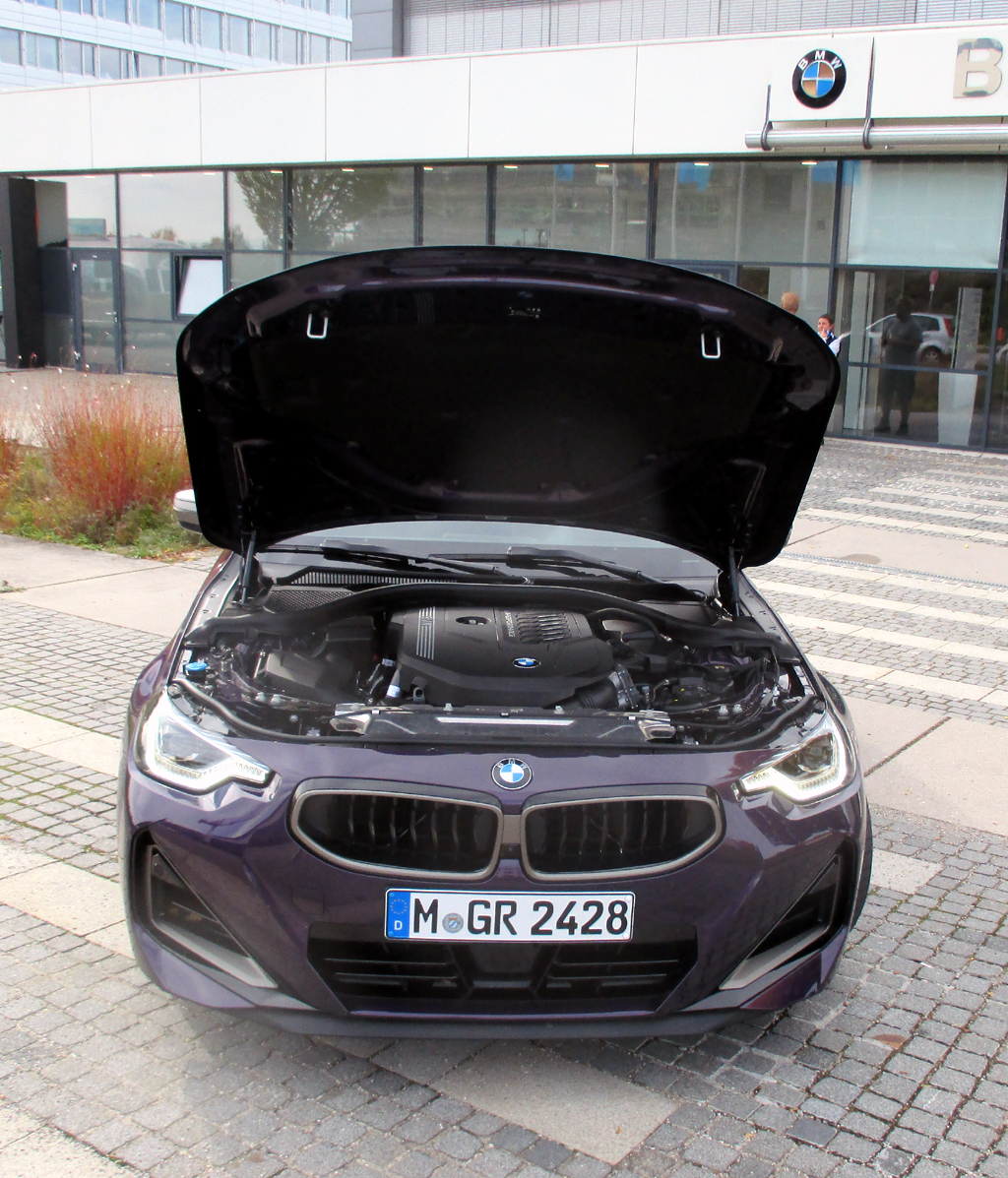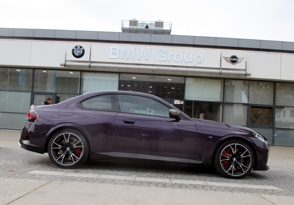 Das Auto: Das 2er-Coupé, 4,53 Meter lang, 1,83 Meter breit, nur 1,39 Meter hoch, Radstand 2,74 Meter, Kofferraum jetzt 390 Liter hinter der niedrigeren Ladekante, hat gegenüber dem Vorgänger in Länge, Breite und beim Radstand zugelegt, baut etwas flacher. Das Design wirkt athletischer, die Front mit Einzelscheinwerfern, neu gestalteter Doppelniere und vertikal angeordneten, aktiven Luftklappen markanter. Aerodynamisch hat es Verbesserungen gegeben. Die Linienführung verläuft ziemlich dynamisch. Die Silhouette ist sportlich. Einzelne Flächen sind muskulöser modelliert. Die Spurweiten sind breiter. Die weit ausgestellten Radhäuser lassen die Heckansicht mit dort neu strukturierten LED-Lichtfunktionen kraftvoller erscheinen. Innen ist das Premiumambiente mit hochwertigen Materialien, präziser Verarbeitung und exklusiveren Designmerkmalen verfeinert. Man sitzt tief. Das Raumgefühl ist angenehmer. Vorn ist ordentlich Platz vorhanden, im nicht ganz so gut erreichbaren Fond geht es beengter zu. Die Bedienung im Serien-Live-Cockpit mit 8,8-Zoll-Kontrolldisplay, 5,1-Zoll-Instrumentenkombi und Cloud-basierter Navigation ist wie beim 4er-Gran-Coupé bei aller Modernität und Digitalität doch rasch im Griff. Die Smartphone-Einbindung gibt’s leider nur als Option.