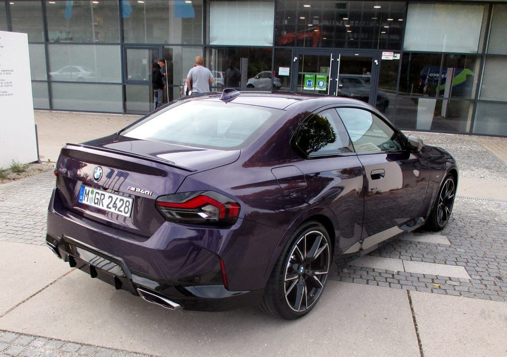 Das Fahren: Der Wagen ist eindeutig Performance-orientiert, wozu auch hohe Steifigkeit, Leichtbau, fast ausgeglichene 50:50-Achslastverteilung und tiefer Schwerpunkt beitragen. Die Fahrwerkstechnik für sportlichere Fahreigenschaften haben die Münchner dabei aus der 4er-Reihe übertragen und entsprechend angepasst, was die, die sich ambitionierter fortbewegen wollen, insbesondere an der Agilität, der Lenkpräzision, der Kurvendynamik, dem Eigenlenkverhalten und der Querbeschleunigung für dynamischere Kurvenfahrten einschließlich noch einigermaßen kontrollierbarer Driftmanöver merken. Der Allrad erhöht beim M240i xDrive mit der Bodenhaftung die Stabilität beim Fahren. Hinzu kommt durch optimiertem Abroll- und Akustikkomfort durchaus die Tauglichkeit für längere Strecken. Die Servotronic-Lenkung richtet sich an der Geschwindigkeit aus, gibt direkte Rückmeldung von der Straße. Die vorn und hinten innenbelüften Scheibenbremsen packen wohldosiert und standfest zu. Leerlaufsegeln ist in den Modi Eco Pro und Komfort möglich. Wer will, kann das optionale M-Sportfahrwerk samt variabler Sportlenkung ordern.