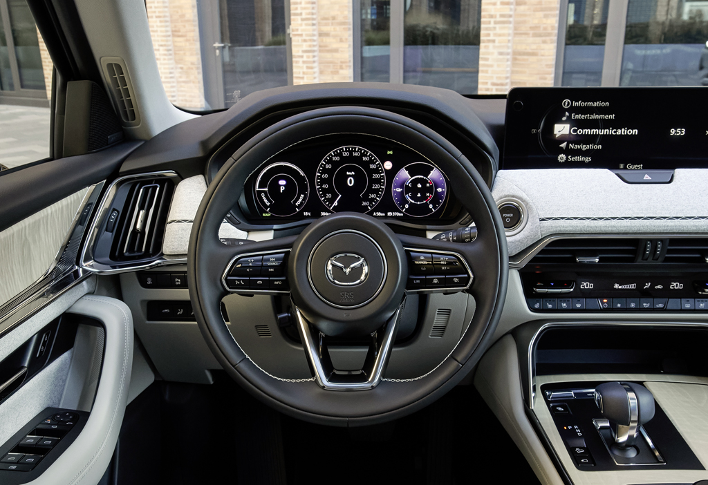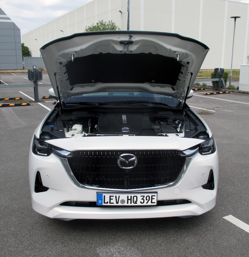 Der Antrieb: Beim vorerst einzig verfügbaren Plug-in-Hybrid arbeiten ein 2,5-Liter-Vierzylinder-Benziner mit 192 PS und ein 175-PS-Elektromotor zusammen. Sie bringen es im System auf 327 PS und 500 Newtonmeter Drehmoment bei 4000 Touren, beschleunigen den leer 2055 bis 2147 Kilo schweren Teilzeitstromer in 5,8 Sekunden aus dem Stand auf Tempo 100, schaffen in der Spitze 200/140 Stundenkilometer (Hybrid-/Elektromodus). Der Antrieb erfolgt über alle vier Räder. Beim Getriebe handelt es sich um einen Acht-Stufen-Automaten. Die elektrische Reichweite gibt Mazda mit 63 Kilometern an, den Verbrauch kombiniert nach WLTP pro 100 Kilometer mit 1,5 Litern Benzin und 23,0 Kilowattstunden Strom. Bei uns hat der Bordcomputer am Ende der ersten Ausfahrt mit wechselnden Fahrprofilen 2,2 Liter und nur 17,8 Kilowattstunden angezeigt. Die Abgasnorm ist Euro-6d.