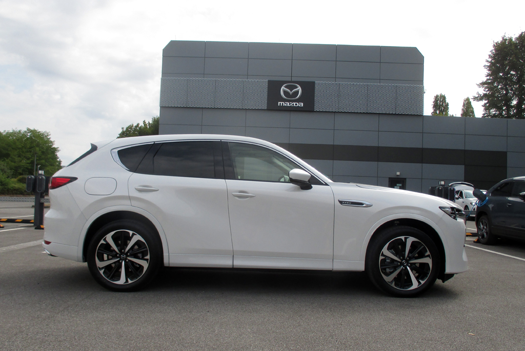 Heck-/Seitenansicht des CX-60. Und der fünftürige Fünfsitzer von der Seite