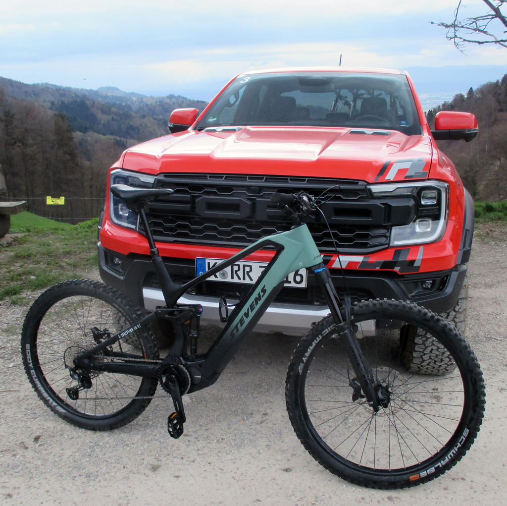 Ranger Raptor mit Stevens-E-Bike: Ford bekräftigt auch damit seine neue "Lust auf Abenteuer"-Positionierung. Foto: Koch