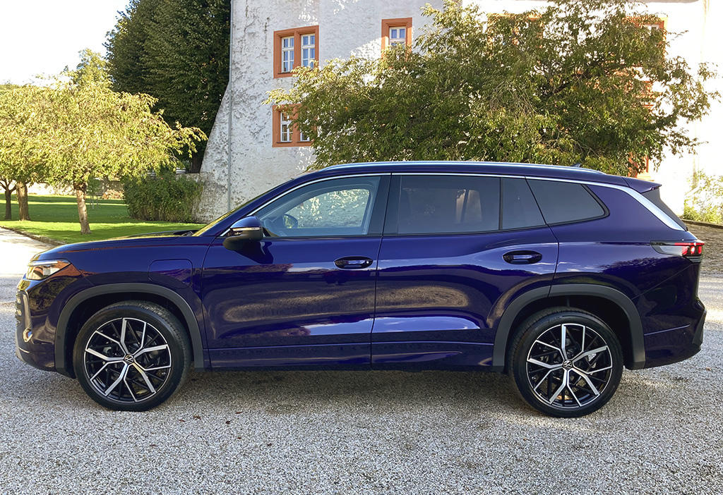 Von außen kommt der für Europa entwickelte und in Wolfsburg gebaute Fünf- oder sogar Siebensitzer recht bullig und mit doch ziemlich markantem Design daher. Insgesamt streckt sich die Karosserie über rund 4,8 Meter. Der Überhang vorn ist lang, der hinten kurz. Die kantigen Radkästen für 17 bis 20 Zoll große Räder sind eckig ausgeschnitten. Die Front verläuft höher. Die Seitenfenster hinten scheinen größer geformt. Bis Reihe zwei ist innen spürbar mehr Platz vorhanden. Das Kofferraumvolumen des Fünftürers soll je nach Konfiguration als Fünfsitzer stolze 750 bis 2090 Liter betragen, als Siebensitzer mit der eigentlich nur für Kinder geeigneten dritten Sitzreihe immerhin noch 345 bis 1905.