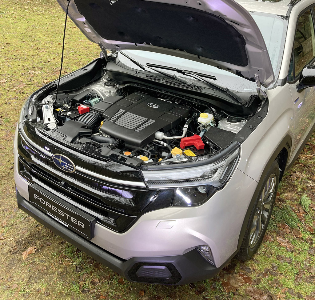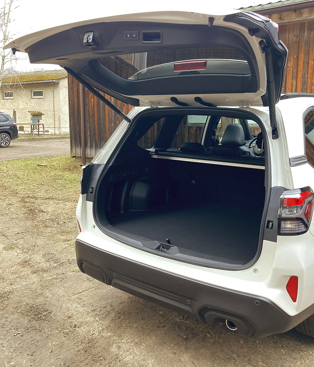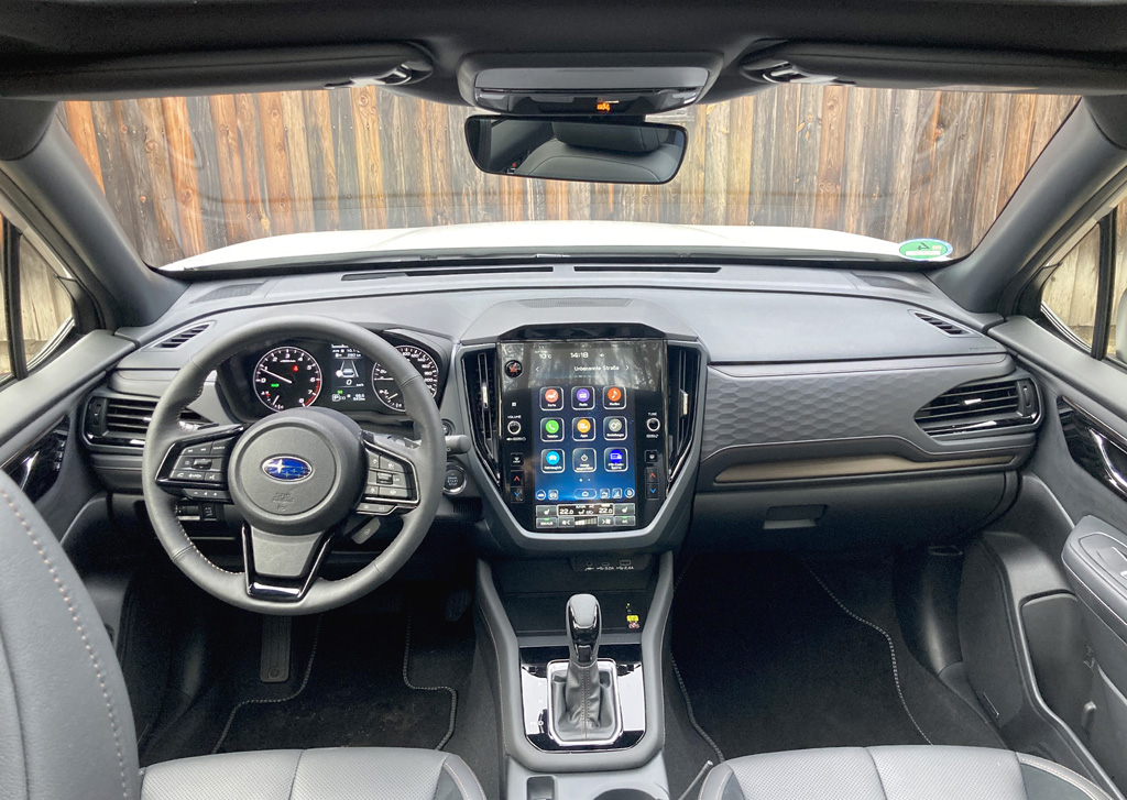 Das Fahren: Die Mildhybridauslegung verbessert durch die zusätzliche Leistung und das zusätzliche Drehmoment die Beschleunigung und die Durchzugskraft. Zudem soll weniger Sprit verbraucht werden, zumal schon der von Subaru angegebene relativ hoch ist. Verbrennungs- und Elektromotor arbeiten abhängig von der jeweiligen Fahrsituation automatisch zusammen. Kurzzeitig ist sogar rein elektrisches Fahren möglich. Die Fahrdynamikregelung gehört zu den Standards an Bord. Im Sportmodus erlaubt die adaptive Getriebesteuerung dynamischeres Unterwegssein. Die Drehmomentverteilung zwischen Vorder- und Hinterrädern hat höhere Leistung, komfortableres, reaktionsschnelleres Ansprechverhalten sowie stabileres Handling selbst in Kurven zur Folge. Die Anhängelasten im Zugbetrieb reichen bis 2055 Kilo. Die Serien-Gespannstabilisierung soll ein Aufschaukeln verhindern. Die Lenkung wirkt direkter, vermittelt ein natürlicheres Lenkgefühl. Die Wankneigung scheint geringer. 22 Zentimeter Bodenfreiheit, ausreichend Böschungs- und Rampenwinkel sind nützlich im Gelände. Genauso die erweiterte X-Mode-Allradassistenz für mehr Traktion auf unterschiedlichem Terrain. Die vorn und hinten innenbelüfteten Scheibenbremsen sorgen für standfeste Verzögerung.