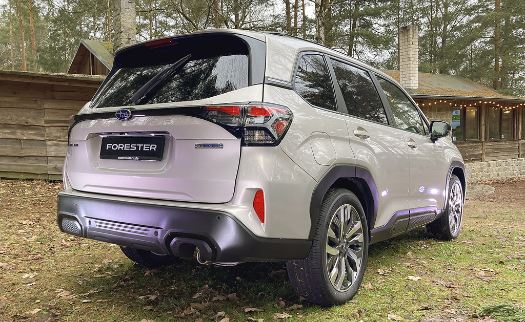 Heck-/Seitenansicht des fünftürigen Fünfsitzers. Und so sieht der Forester seitlich aus.