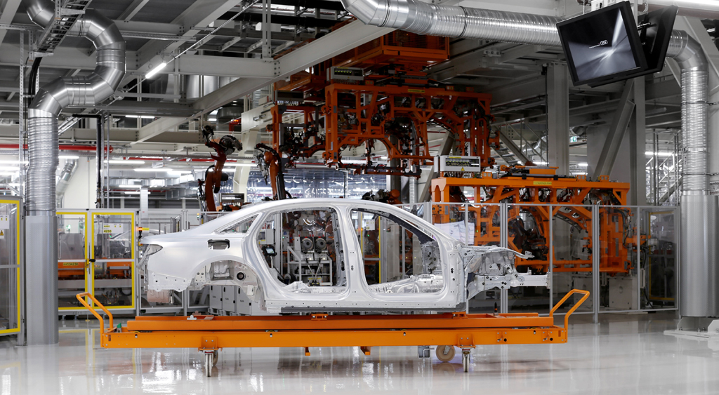 Mit intelligentem Materialmix: A8-Rohkarosse im Audi-Karosseriezentrum Neckarsulm. Foto: Audi