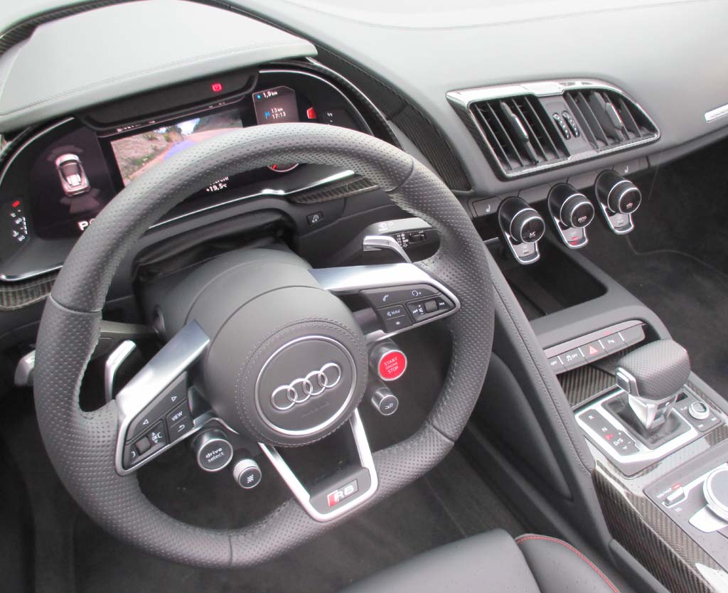Das Monoposto-Cockpit fasst die wichtigsten Funktionen am Sportlederlenkrad mit zwei Satellitentasten zusammen. Die virtuellen Anzeigen im 12,3-Zoll-Farbdisplay lassen sich frei konfigurieren. Navigation ist Serie. Ebenso sind es Sprachsteuerung und Gurtbandmikrofone für komfortables Telefonieren. Zum ersten Mal hat Audi Lautsprecher in die Kopfstützen eingebaut.