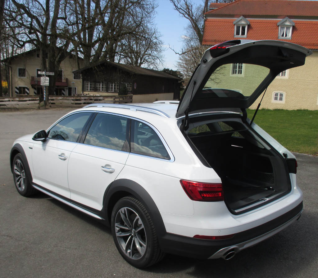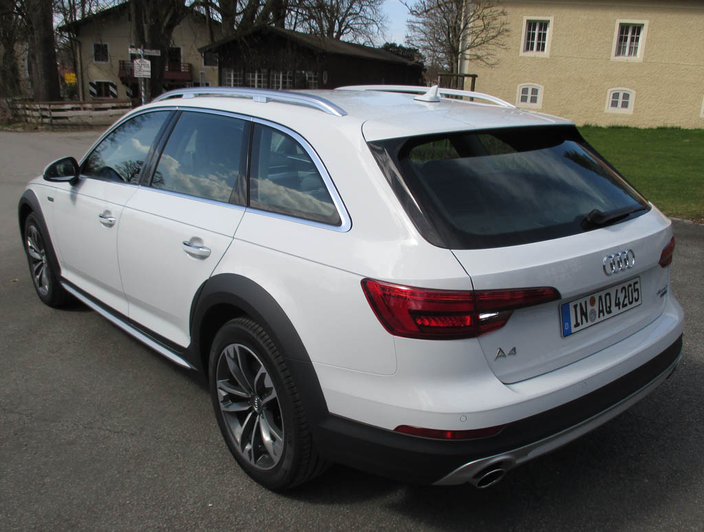Wie die übrigen A4-Serienbrüder fährt der 4,75 Meter lange Allroad Quattro sauber verarbeitet vor, mutet ziemlich wertig an. Platz ist bei 2,81 Metern Radstand selbst im Fond noch ganz ordentlich vorhanden. Das Gepäckabteil fasst 505 bis 1510 Liter. Die Bedienung im sportlich-funktionellen Cockpit ist rasch im Griff. Außen fallen die gepfeilte Front, die ausgestellten Radläufe und der markante Stoßfänger hinten auf. Es gibt einen Unterfahrschutz und einen Heckdiffusor. Gegenüber dem ab 36 900 Euro teuren A4 Avant sorgen die 23 Millimeter höhere Trimmlage und die größeren 17-Zoll-Räder für 34 Millimeter mehr Bodenfreiheit. Die Neuauflage, so Burkhard Wiegand, Technischer Projektleiter der A4-Baureihe, jetzt bei der Fahrvorstellung von München nach Kolbermoor bei Rosenheim, bringt bis zu 90 Kilo weniger Gewicht auf die Waage.