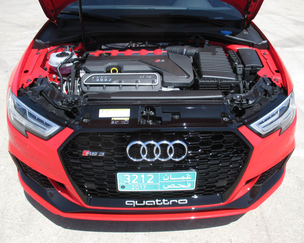 Der Antrieb: „Der weltweit stärkste Fünfzylinder“, betont Marketing-Mann Michel, „ist zugleich unser stärkstes Verkaufsargument.“ Bei dem Turbobenzindirekteinspritzer handelt es sich nach Angaben von Technik-Chef Stephan Reil um einen um 33 auf 400 PS leistungsgesteigerten 2,5-Liter mit 480 Newtonmetern, der hoch bis auf 7000 Touren dreht, den Spurt aus dem Stand auf Tempo 100 in 4,1 Sekunden und in der Spitze 250, optional sogar bis zu 280 Stundenkilometer schafft. Eine Siebengang-Doppelkupplungsbox überträgt die Kraft auf die Räder. In Verbindung mit der Stopp/Start-Spritsparautomatik gibt Audi den Mixverbrauch zumindest im Datenblatt mit knapp unter achteinhalb Litern an.