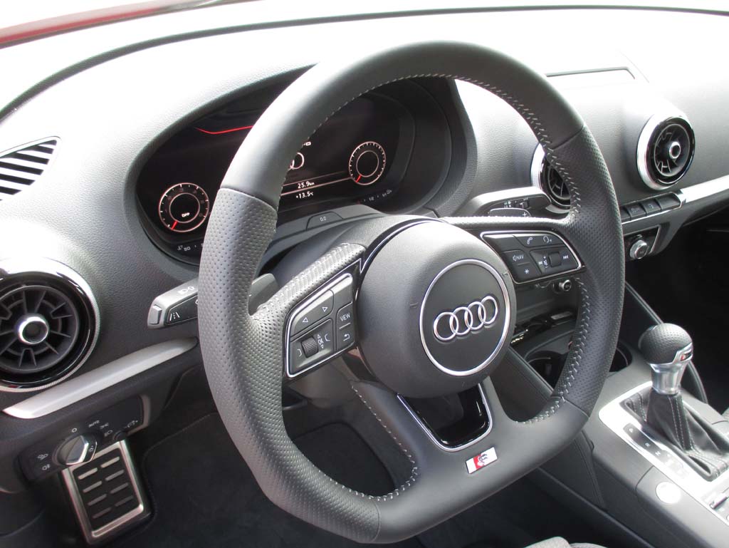 Die aktualisierte Auflage kommt äußerlich im Detail durch gestalterische Kniffe noch etwas breiter wirkend daher, obwohl sich an den Abmessungen nichts geändert hat. Sie fährt sauber verarbeitet vor, mutet wertig an, Platz ist selbst im Fond und Kofferraum noch ganz ordentlich vorhanden, ist schon im Grundumfang etwas umfangreicher bestückt. Neu sind die Ausstattungslinien Sport und Design. „Erstmals ist damit auch eine Differenzierung beim Exterieur möglich“, sagt Produktmarketing-Mann Andreas Mauthe jetzt bei der Fahrvorstelling in Aschheim bei München. Vernetzung und Digitalisierung bis hin nunmehr schon zum virtuellen Cockpit gehen auch beim A3 weiter.