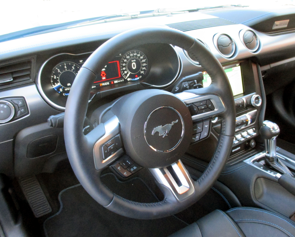 Der Antrieb: Um den kümmern sich wie gehabt zwei Benziner, der 2,3-Liter-Vierzylinder-Turbo, im GT der 5,0-Liter-Achtzylinder. Durch den Partikelfilter hat sich die Leistung des kleineren Ottomotors um 27 auf 290 PS verringert, dafür ist die Durchzugskraft mit 440 Newtonmetern größer geworden. Der Achtzylinder hat bei der Leistung um 29 auf 450 PS zugelegt. Je nach Karosserievariante und Getriebe – manuell mit sechs Gängen und spezieller Anpassung der Drehzahl für sanftere Schaltvorgänge mit markanterer Akustik oder neue Automatik sogar mit zehn Stufen für 2500 Euro Aufpreis – sind beide aus dem Stand in 5,5 bis 6,0 oder nur 4,3 bis 4,8 Sekunden auf Tempo 100, in der Spitze bis 233 oder 250 Stundenkilometer schnell. Den Verbrauch gibt Ford zumindest im Datenblatt günstigstenfalls mit 9,0 bis 9,5 und 12,1 bis 12,8 Litern an.
