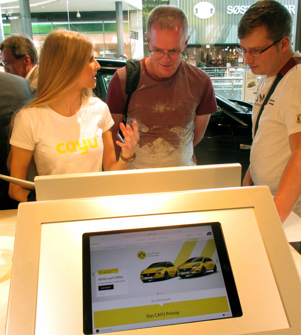 Hinter Cayu – die Abkürzung steht für „Car for You“, also „Auto für Dich“ – verbirgt sich eine neuartige Plattform für den elektronischen Handel, kurz: die Idee, Offline- und Online-Shopping in einem digitalen Lifestyle-Kauferlebnis miteinander zu verbinden. „Das geht jedoch nicht am Handel vorbei“, versichert Keller und fügt hinzu: „Wir müssen aber einfach dahin, wo die Menschen sind!“ Allein das 1996 eröffnete Centro in Oberhausen mit seinen mittlerweile rund 250 Einzelhandelsgeschäften mitten im Ruhrgebiet soll zuletzt rund 23 Millionen Besucher gezählt haben. Cayu im Borussen-Fanshop im Oberhausener Centro ist dabei nicht der erste Opel-Store dieser Art. Im September haben die Rüsselsheimer schon einen im Stuttgarter Milaneo eröffnet, betrieben von einem Händler vor Ort. Der zweite findet sich vornehmlich für Mitarbeiter im Adam-Opel-Haus am Stammsitz. „Menschen in Metropolregionen sind es gewohnt, alles zentrumsnah erledigen zu können“, verweist Keller darauf, dass sich viele Autohäuser aber oft außerhalb in Industriegebieten finden.