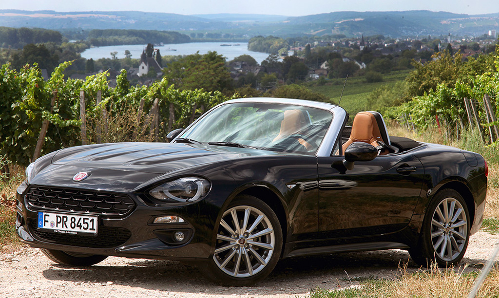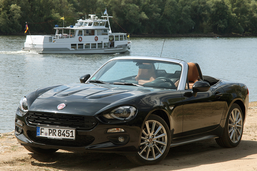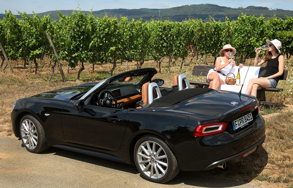 Der Name 124 Spider ist eine Reminiszenz an den zwischen 1966 und 1985 gebauten Fiat 124, der damals auch als Roadster, eben Spider genannt, erhältlich war. Auch dieser fröhliche Geselle (rechts) an einem Café-Restaraunt in Assmannshausen dürfte seine Freude an dem Wagen haben, wenn auch hoffentlich dann gänzlich ohne Wein!
