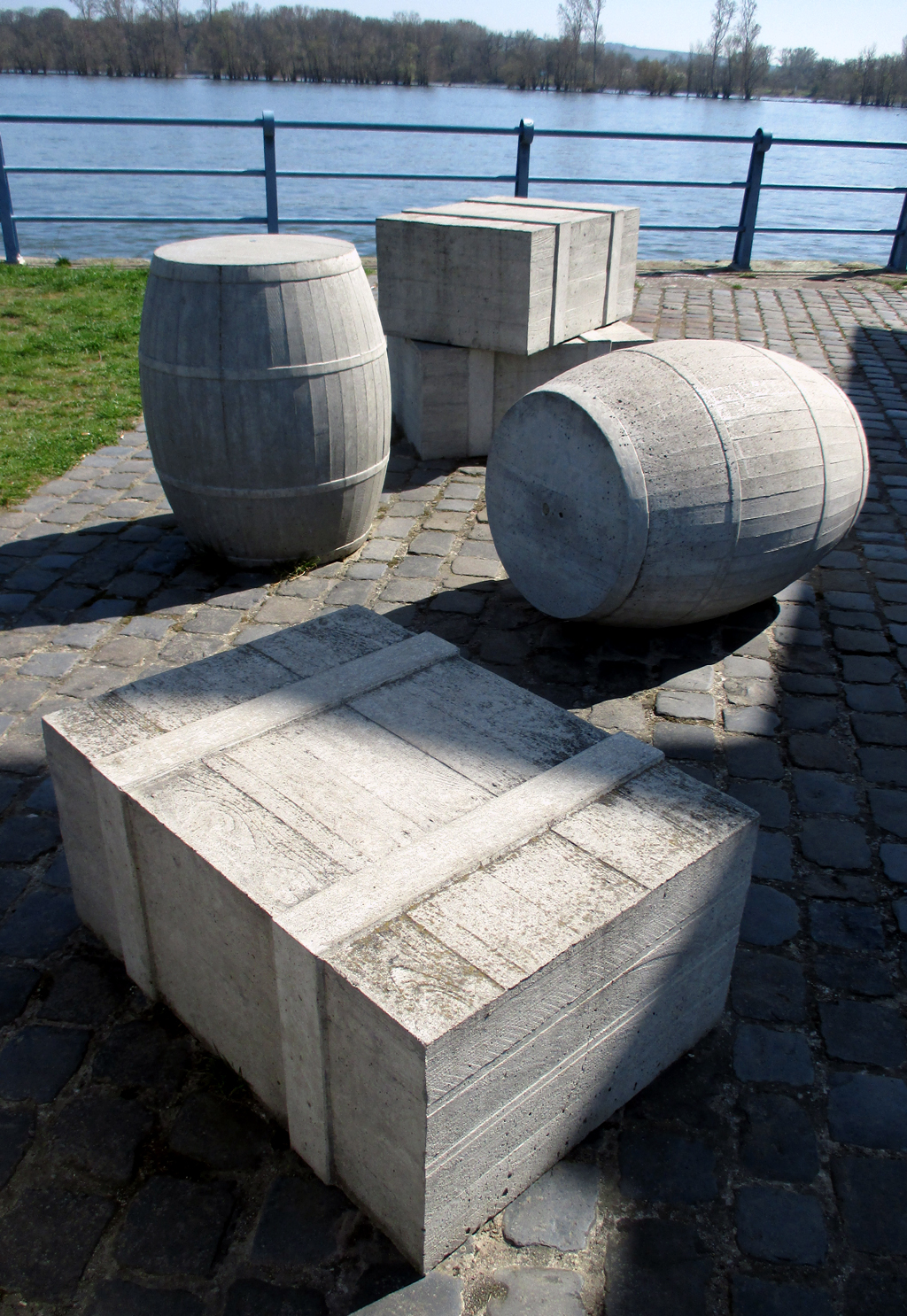 Am Rhein unten weisen Fässer und Kisten (links) beim Hebekran von Oestrich-Winkel darauf hin, worum es hier früher ging, nämlich das Beladen der Schiffe mit begehrter Fracht, dem Riesling! Ob der bei 39 Grad Außentemperatur, die uns der Spider am ersten Sonntag im August anzeigt, noch besser gedeiht – oder eher Sonnenbrand bekommt?