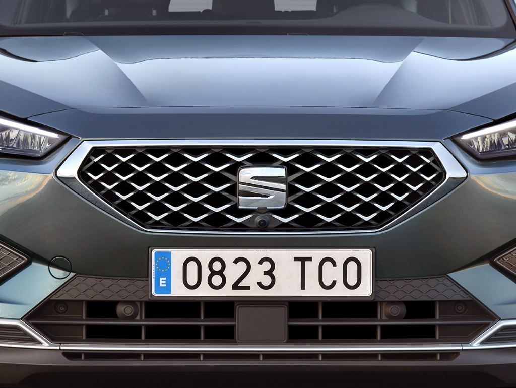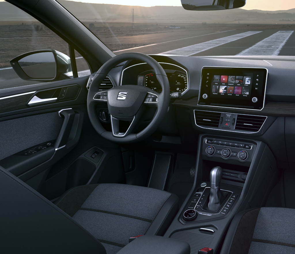 Blick auf die markante Frontpartie und in das sehr übersichtlich gestaltete Cockpit des großen Seat-SUV,