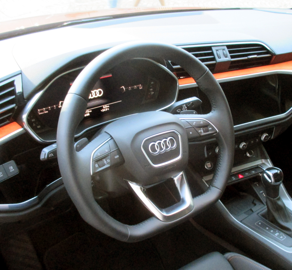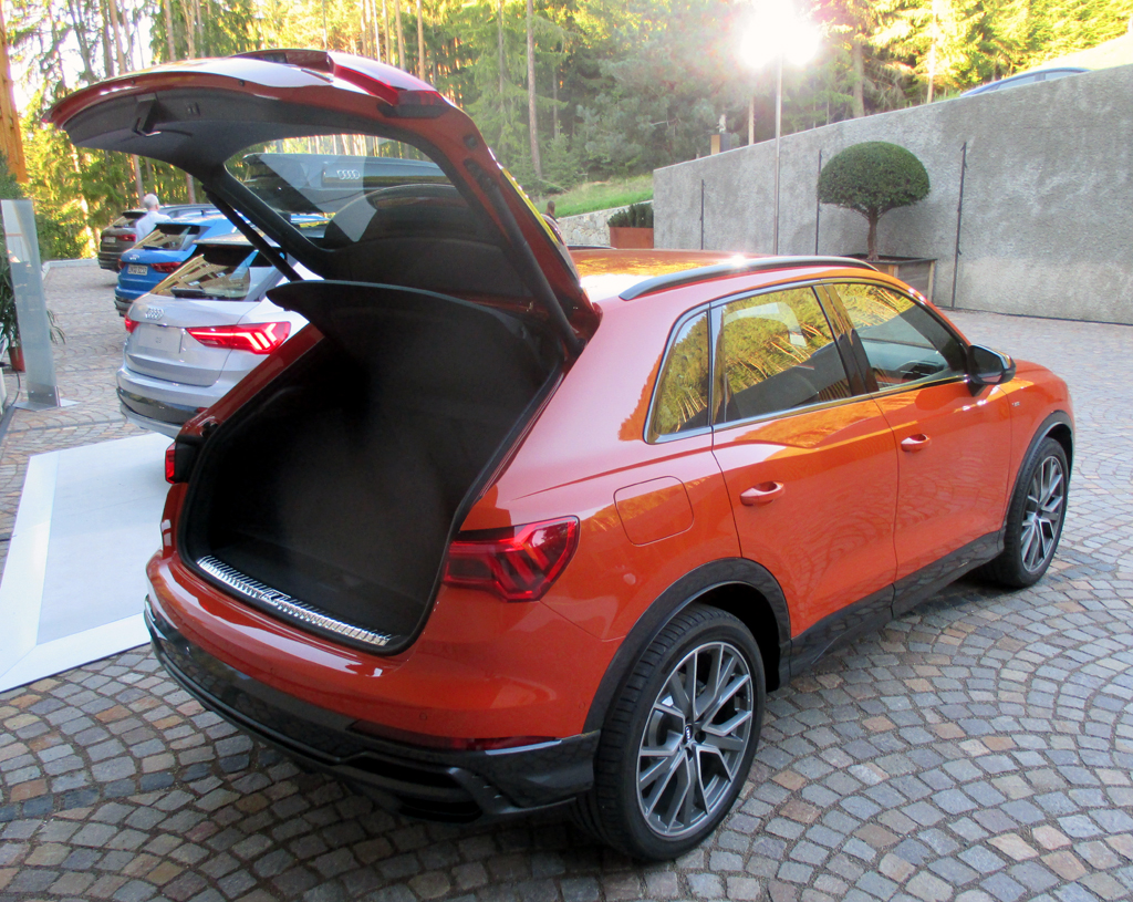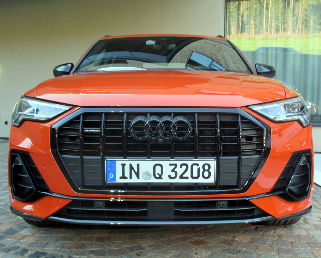 Die Ausstattung: Drei Lines gibt es. Die über dem Basismodell gehen entweder in Richtung Design oder Richtung S-Line-Sportlichkeit. LED-Scheinwerfer sind Standard. In den beiden höheren Ausstattungen ist der Q3 serienmäßig mit Sportsitzen bestückt. Das Kontur-/Ambientepaket erlaubt gezielte Lichteffekte im Dunkeln, einstellbar in 30 Farben. Das Optionskonzept bis hoch zum virtuellen Cockpit mit 12,3-Zoll-Diagonale und 10,1-Zoll-Touchdisplay ist mehrstufig gestaltet. Das Spitzen-Infotainmentsystem verfügt über Navigation. Hinzu kommt Vernetzung von Auto, Smartphone und Funktionssteuerungen aus der Ferne. Moderne Elektronikhilfen sind ab Werk an Bord oder wie die adaptive Fahr-, Park-, Querverkehrsassistenz und Umgebungskameras gegen Aufpreis erhältlich. Ebenfalls eine elektrische Heckklappe samt Bedienung per Fußgeste ist lieferbar.
