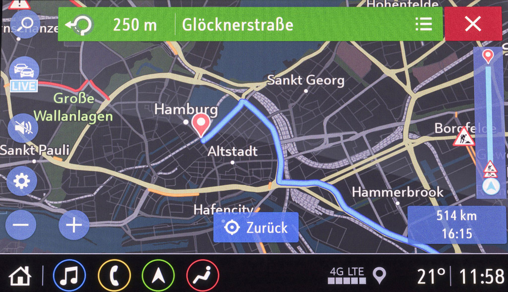 Das Bedienkonzept ist intuitiver. Auf wichtige Funktionen kann direkter zugegriffen werden. Der sogenannte Home-Button macht alles benutzerfreundlicher. Die Statusleiste ist immer sichtbar. Einfaches Wischen erleichtert die Handhabung. Bis zu fünf verschiedene Profile, einfach austauschbar, sind möglich. Individuelles Infotainment und Fahrzeugeinstellungen sind mit jedem Profil verknüpft, „können sogar“, so Gruner, „mit dem Zündschlüssel gekoppelt werden“. Zur vernetzten Navigation gehören die Bereiche Live Verkehr, Benzinpreise und Parkinformationen. Die Onlinesuche erfolgt über aktuelle Points of Interest aus der Cloud. Vorausschauende Navigation ist durch Zielerkennung über Fahrmuster und Berücksichtigung von üblichem Verkehrsaufkommen zur genauen Bestimmung der Ankunftszeit möglich. Viermal pro Jahr werden Onlinekarten aktualisiert.