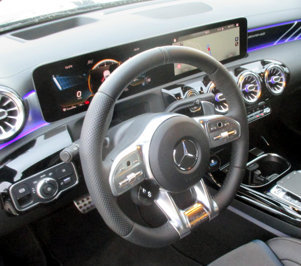 Das Auto: 2013 sind die Affalterbacher mit dem A45 ins Kompaktsegment eingestiegen. Kunden hätten seitdem mehr als doppelt so viele Kompaktfahrzeuge bestellt, betont Jastrow, als ursprünglich gedacht. Das habe AMG bestärkt, das Portfolio auszubauen und auf eine breitere Basis zu stellen – eben jetzt mit dem A35 4Matic, sauber verarbeitet, wertig anmutend, 4,41 Meter lang, Radstand 2,72 Meter, Kofferraum 370 bis 1210 Liter. Die Bedienung ist nach kurzer Eingewöhnung rasch im Griff. Bei dem Multimediasystem handelt es sich um das neue aus der aktuellen A-Klasse, volldigital im Widescreen-Format, bei dem drei AMG-typische Anzeigenstile wählbar sind.