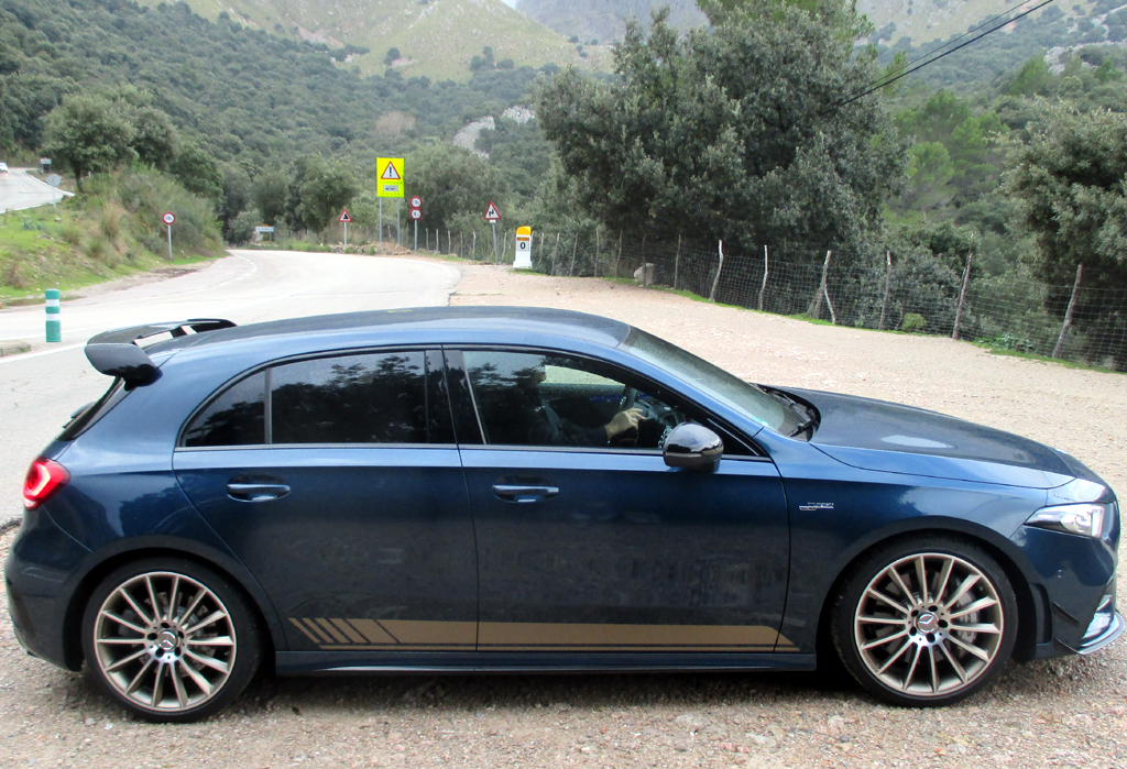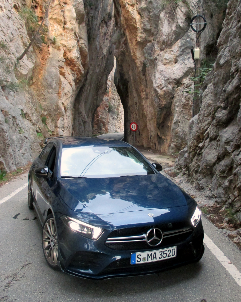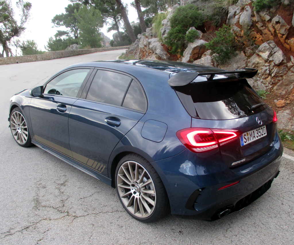 Der Antrieb: Der 306 PS starke Turbobenziner, ein nach AMG-Ansprüchen weiterentwickelter Serienmotor, liegt mit seiner fahrdynamischen Auslegung etwa in der Mitte zwischen dem normalen A250 mit 224 und dem Vorgänger, dem A45 mit 381 PS. Sein maximales Drehmoment steht bei durchzugstärkeren 400 Newtonmetern an. In 4,7 Sekunden beschleunigt der 2,0-Liter-Vierzylinder den leer 1555 Kilo schweren AMG auf Tempo 100, schafft 250 Stundenkilometer Spitze. Eine spezifisch übersetzte Siebengang-Doppelkupplungsbox überträgt die Kraft auf die Räder. In Verbindung damit soll der Verbrauch im Mix unter siebeneinhalb Liter betragen, zumindest laut Datenblatt. Bei uns hat der Bordcomputer am Ende nach wechselnden, teils aber auch flotteren Fahrprofilen auf kurvenreicheren Strecken durch das Tramuntana-Gebirge 8,9 Liter angezeigt.