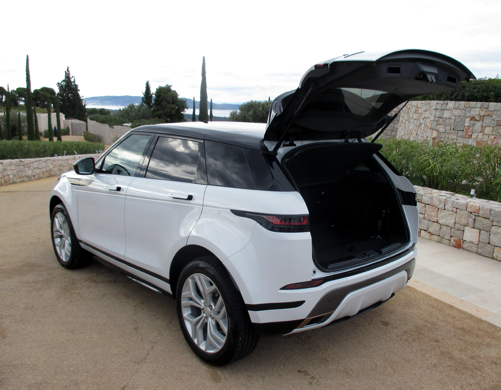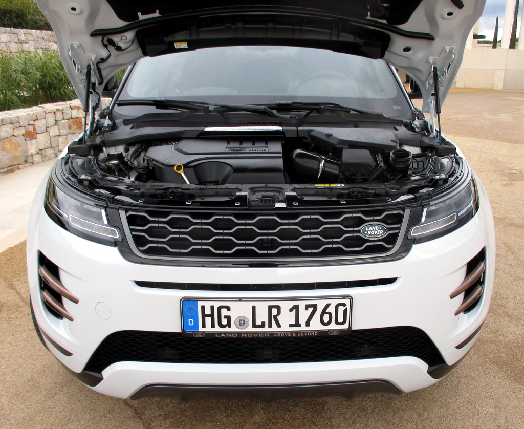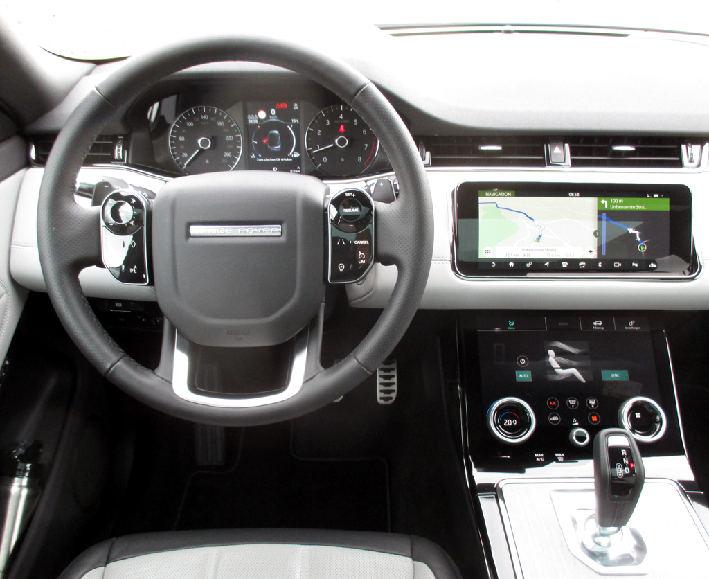 Die Ausstattung: Über dem Basismodell finden sich bis hoch zur First Edition noch acht einzelne Lines. Das aus zwei gläsernen Touchscreens bestehende Infotainment ist mit schnellerer Software bestückt, dem ein 12,3-Zoll-Display zur Instrumentenanzeige und ein farbiges Headup-Display zur Seite stehen. Smartphones und mobile Endgeräte sind einfach zu koppeln. Bis zu acht Endgeräte können im neuen Evoque über dessen Hotspot ins Netz gelangen. Auf Knopfdruck ist es möglich, den Innenrückspiegel in einen ebenfalls hochauflösenden Videobildschirm zu verwandeln, was aber gewöhnungsbedürftig ist. Ist die rückwärtige Sicht eingeschränkt, kann das System zur Dachkamera wechseln, die in einem großen 50-Grad-Sichtfeld zeigt, was sich hinter dem Evoque tut. Eine Weltpremiere stellt laut Land Rover die Technologie dar, die die Motorhaube quasi durchsichtig macht, dem Fahrer über Kamerabilder einen 180-Grad-Blick unter den Vorderwagen erlaubt und so engen Parklücken, hohen Bordsteine und anspruchsvollen Gelände deren Schrecken nimmt. Sogenannte „Smart Settings“ nutzen künstliche Intelligenz, um die Vorlieben des Fahrers zu lernen und alle Einstellungen jeweils auf die Lieblingsposition vorzunehmen oderr Verkehrsstörungen auf dem Weg zu häufig angesteuerten Zielen zu melden.
