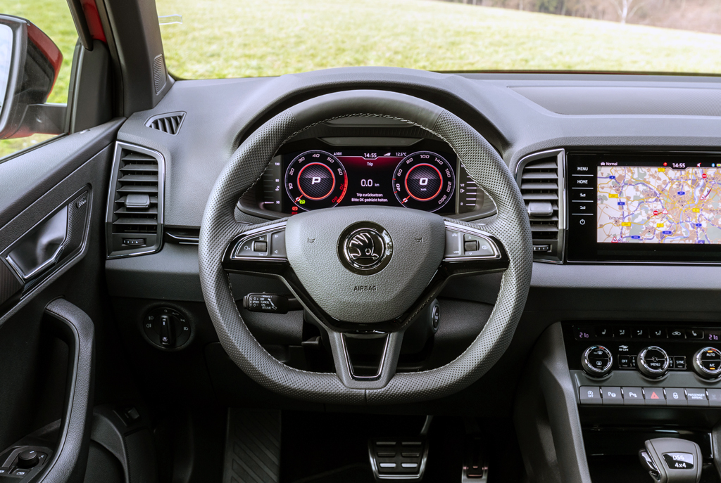 Beim Sportline, links das Cockpit, handelt es sich um eine flottere Variante des kompakten Karoq.