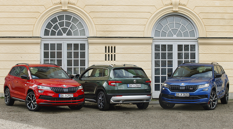 Im Dreierpack: (von links) Skoda Karoq Sportline, Scout und Kodiaq RS. Fotos: Waldinger/Skoda