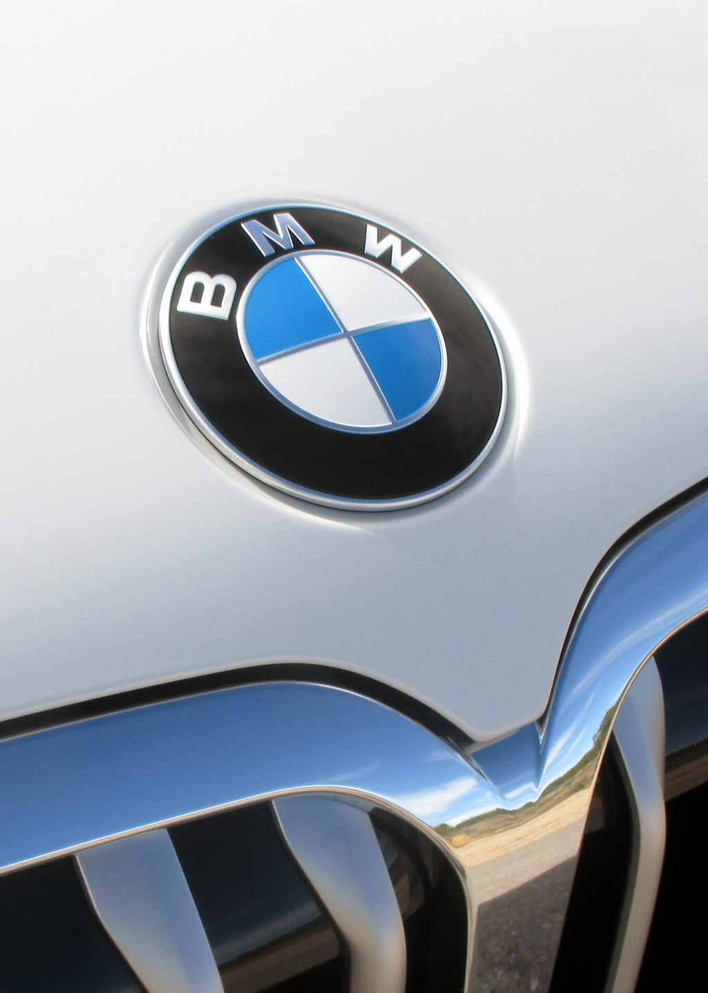 An der Front fällt die gewaltige Doppelniere auf. Das Markenlogo sitzt über dem Kühlergrill.