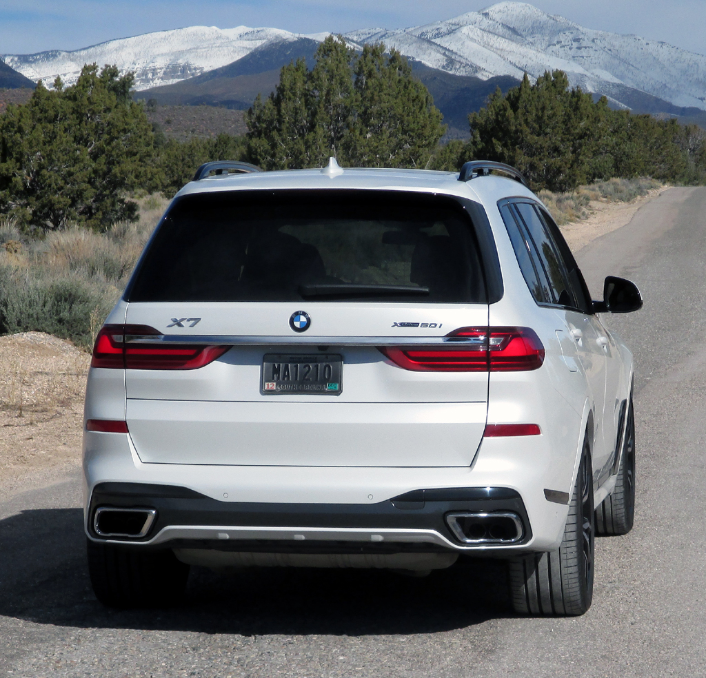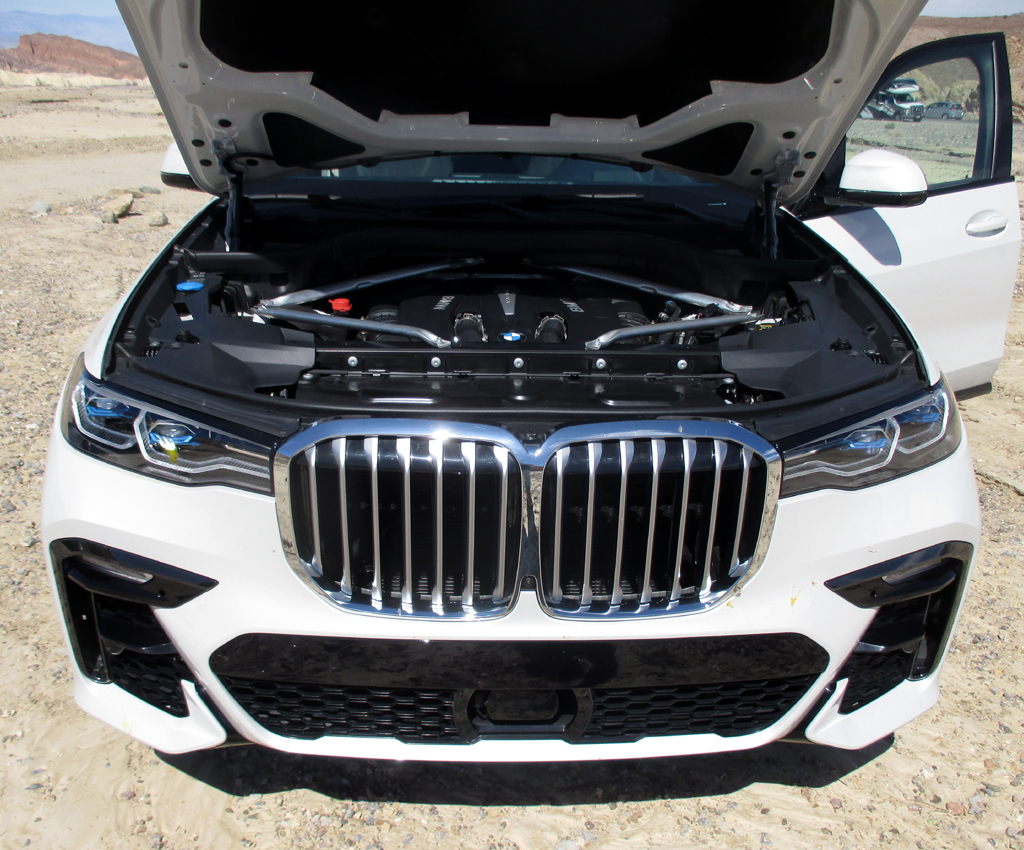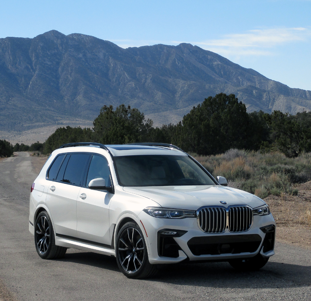 Der Antrieb: Drei nach der Abgasnorm Euro-6d-Temp freigegebene Motorisierungen stehen zunächst zur Wahl. Der bei 86 300 Euro beginnende Turbobenziner xDrive 40i leistet 340, der Turbodiesel xDrive30d 265 und der gleich aus vier Ladern befeuerte Performance-M50d-Diesel 400 PS. Die mit 450 bis 760 Newtonmetern durchzugsstarken 3,0-Liter-Sechszylinder beschleunigen die leer je nach Norm 2320 bis 2535 Kilo schweren Allradriesen, die Lasten von 2,2 bis 2,7 Tonnen ziehen können, in 5,4 bis 7,0 Sekunden aus dem Stand auf Tempo 100, machen sie in der Spitze 227 bis 250 Stundenkilometer schnell. Eine sehr gut abgestufte, auch handschaltbare Achtgang-Automatik überträgt die Kraft auf die Räder. In Verbindung mit der Stopp/Start-Spritspartechnik gibt BMW den Mixverbrauch zumindest im Datenblatt mit 6,5 bis 9,0 Litern an. Wir sind im in Europa nicht angebotenen Achtzylinder-Turbobenziner xDrive50i mit 462 PS unterwegs gewesen. Dessen Bordcomputer hat bei uns am Ende nach moderaten Fahrprofilen auf nicht selten schnurgeraden Strecken durch Nevada und Kalifornien umgerechnet 12,2 Liter angezeigt.