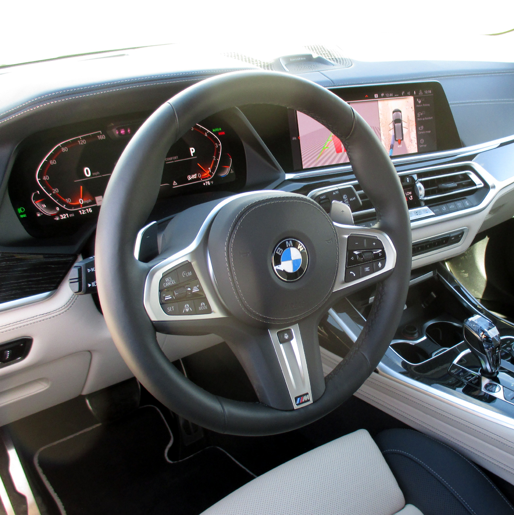 Das Auto: Der X7, sauber verarbeitet, wertig anmutend, gewaltige Doppelniere, 5,15 Meter lang, zwei Meter breit, 1,80 Meter hoch, Radstand 3,10 Meter, serienmäßig sieben Sitze, Kofferraum 326/750 bis 2120 Liter, läuft wie die meisten X-BMW in den USA vom Band, baut technisch auf dem rund 15 000 Euro günstigeren X5 auf. Platz ist selbst im Fond üppig vorhanden. Sogar in der im Wagenboden versenkbaren dritten Reihe herrscht noch ordentlich Kopf- und Beinfreiheit. Das gut beladbare Gepäckabteil ist auch deshalb praktisch, weil die vollelektrische Heckklappe davor zweigeteilt ist. Im volldigitalen Cockpit geht es auch dank der zwei 12,3 Zoll großen, hochauflösenden Bildschirme sehr übersichtlich zu. Nur sollte man sich zur Eingewöhnung in die Bedienung doch etwas Zeit nehmen, um bei aller Digitalität und Vernetzung alles sinnvoll nutzen zu können.