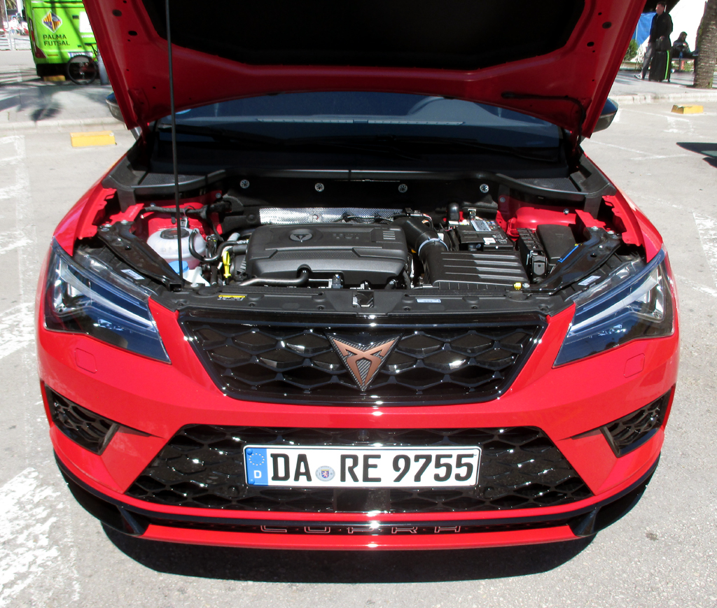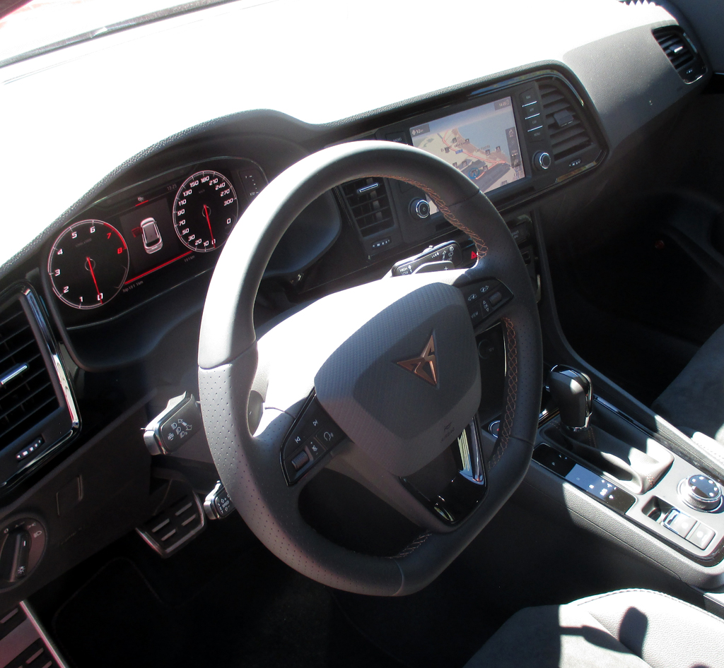 Der Antrieb: Der Cupra Atec ist mit einem 300 PS und 400 Newtonmeter starken 2,0-Liter-Turbobenziner bestückt, der die Abgasnorm Euro 6 erfüllt. Der hoch bis 6500 Touren drehende Vierzylinder mit dem bollernden Sound beschleunigt den leer 1615 Kilo schweren Wagen, der Lasten bis 2,1 Tonnen ziehen kann, in 5,2 Sekunden aus dem Stand auf Tempo 100, macht ihn in der Spitze 247 Stundenkilometer schnell. Eine sehr gut abgestufte, über entsprechende Paddel am Lenkrad auch handschaltbare Siebengang-Automatik mit Doppelkupplung überträgt die Kraft auf alle vier Räder. In Verbindung mit der Stopp/Start-Spritspartechnik gibt Cupra den Verbrauch zumindest im Datenblatt im Mix mit 7,4 Litern an, die wir nicht ganz erreicht haben, denn bei uns hat der Bordcomputer am Ende nach eher moderaten Orts-, Landstraßen- und kurzen Autobahnfahrprofilen 7,8 Liter angezeigt.