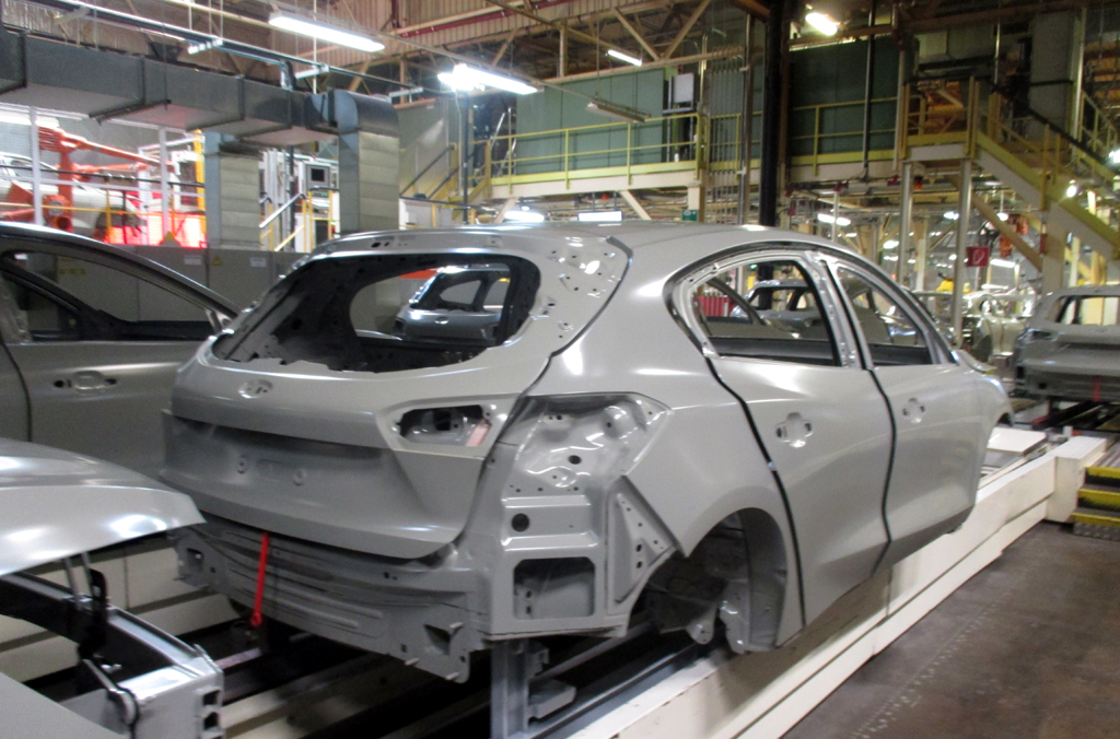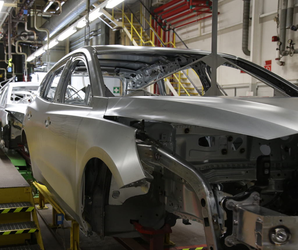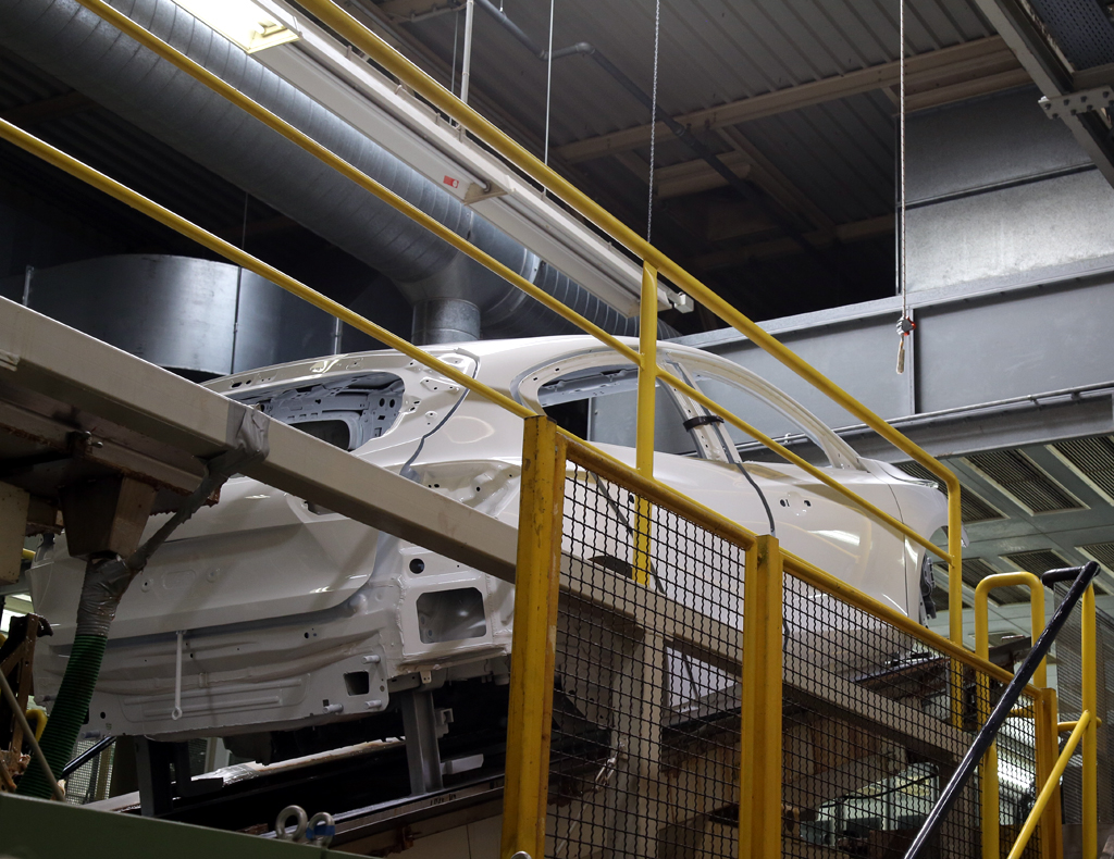 In der Lackiererei ist eine Rohkarosse nach der anderen hintereinander aufgereiht unterwegs.
