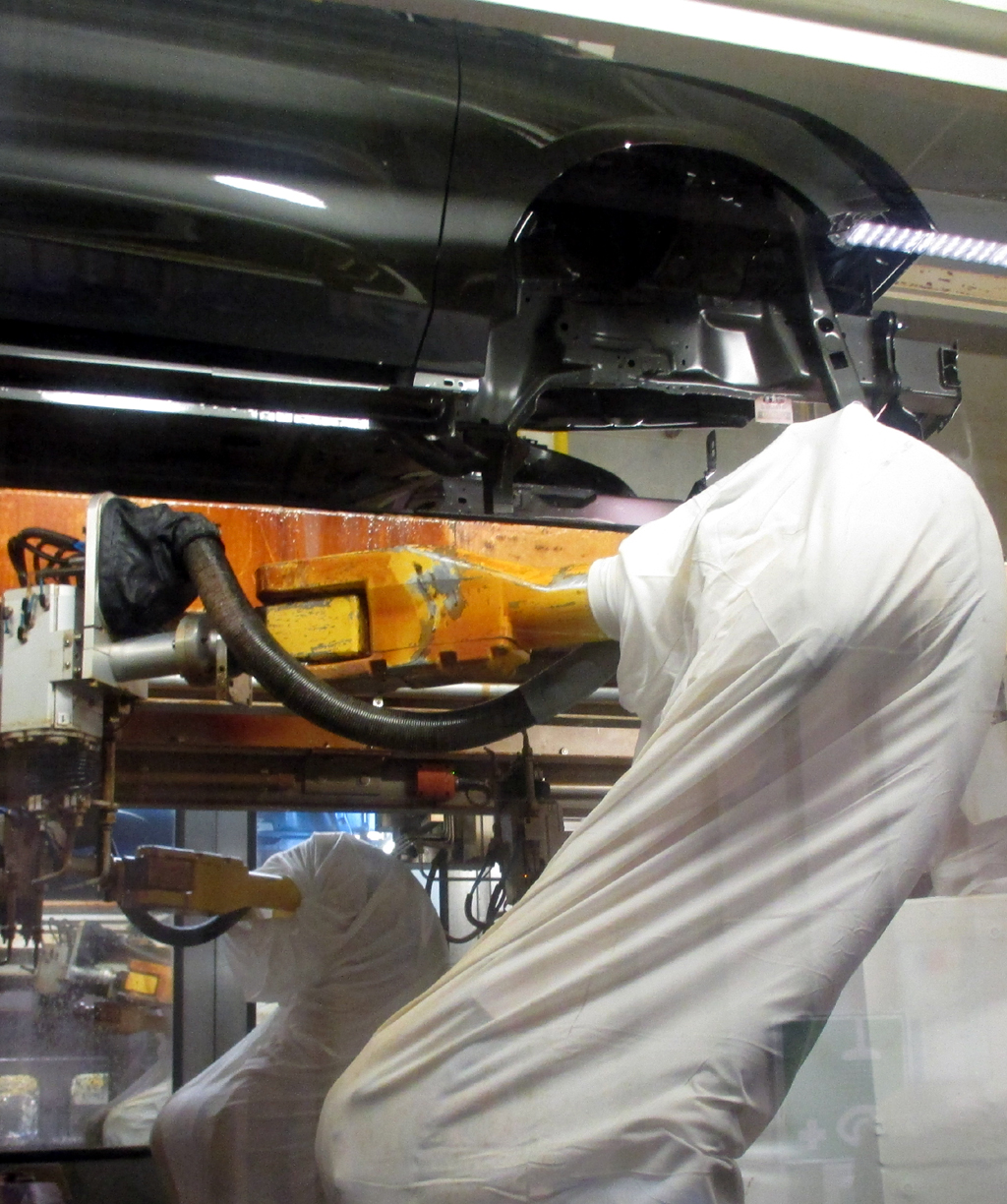 Korrosionsschutz fängt schon im Karosserierohbau an, wo auch für Besucher Schutzbrillen notwendig sind.