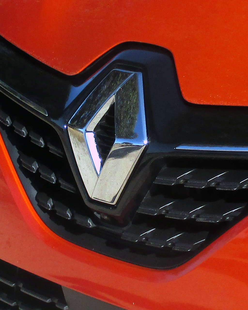Blick auf die Frontpartie mit dem Markenlogo, dem in den Kühlergrill ragenden Rhombus.