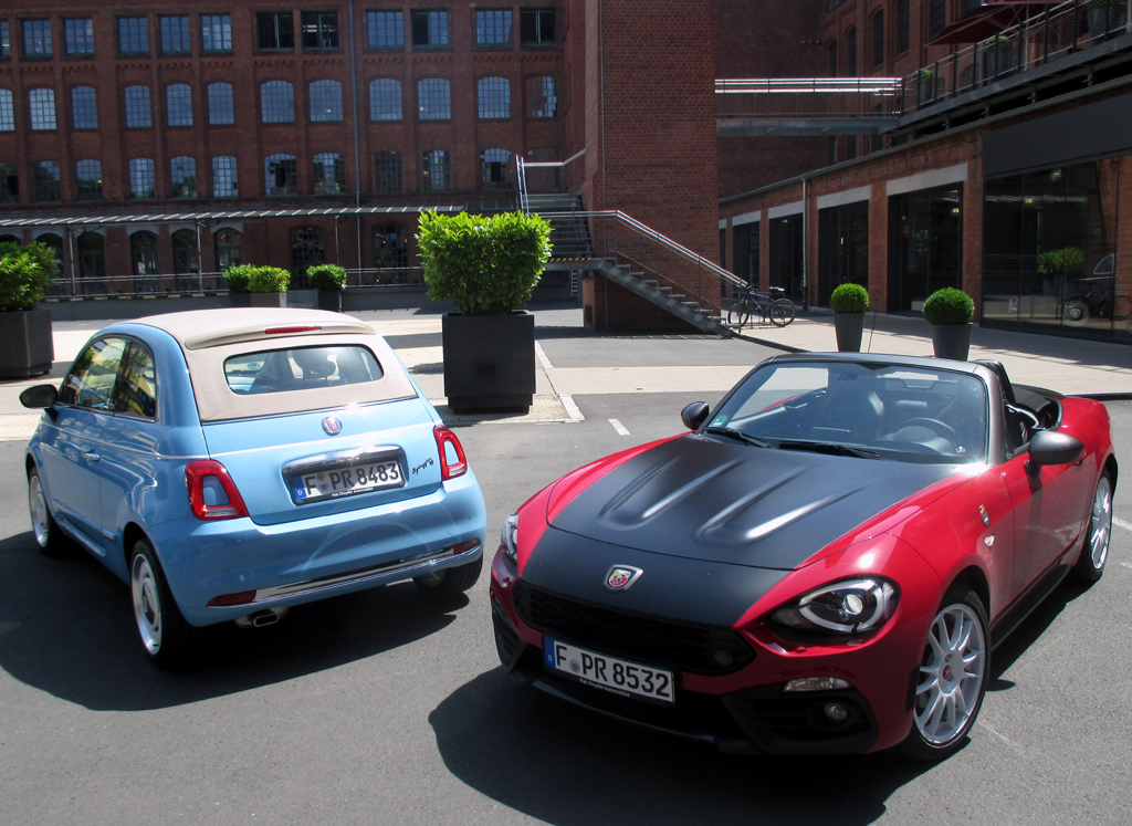 Im Doppelpack: Fiat-500-Cabrio-Sondermodell Spiaggina (links) und Abarth 124 Spider. Fotos: Koch