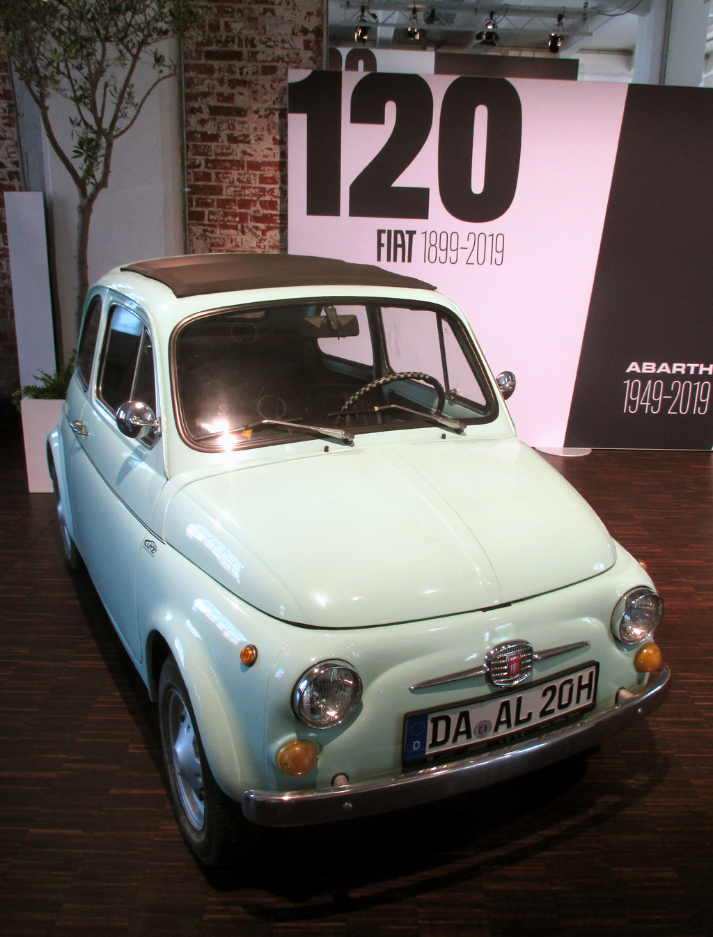 Klassikstadt Frankfurt. Altes Industriegelände. Rote Backsteinbauten. Bilder aus der Fiat- und Abarth-Historie flimmern über eine Leinwand, mal mit etwas eingängigerer, mal mit flotterer Musik unterlegt. Eine italienische Zeitreise beginnt. In einem zur Eventlocation umfunktionierten Gebäude stehen einige alte und ältere Fiat und Abarth zusammen: Der Fiat 508 CS Balilla Coppa d’Oro aus 1934. Der Fiat 500 Topolino aus 1937. Der Fiat 600 Multipla aus 1959, dessen alte Koffer oben auf dem Dach an das Verreisen früher erinnern. Der Fiat Dino 2400 Spider aus 1972. Der Fiat 130 A Berlina aus 1971. Natürlich der Fiat 500 aus 1973. Der Abarth 595 Esseesse aus 1968. Der Abarth 1000 TCR aus 1971. Der Abarth 2000 Sport Spider aus 1968. Die PS-Zahlen reichen von 13,5 bis 250.