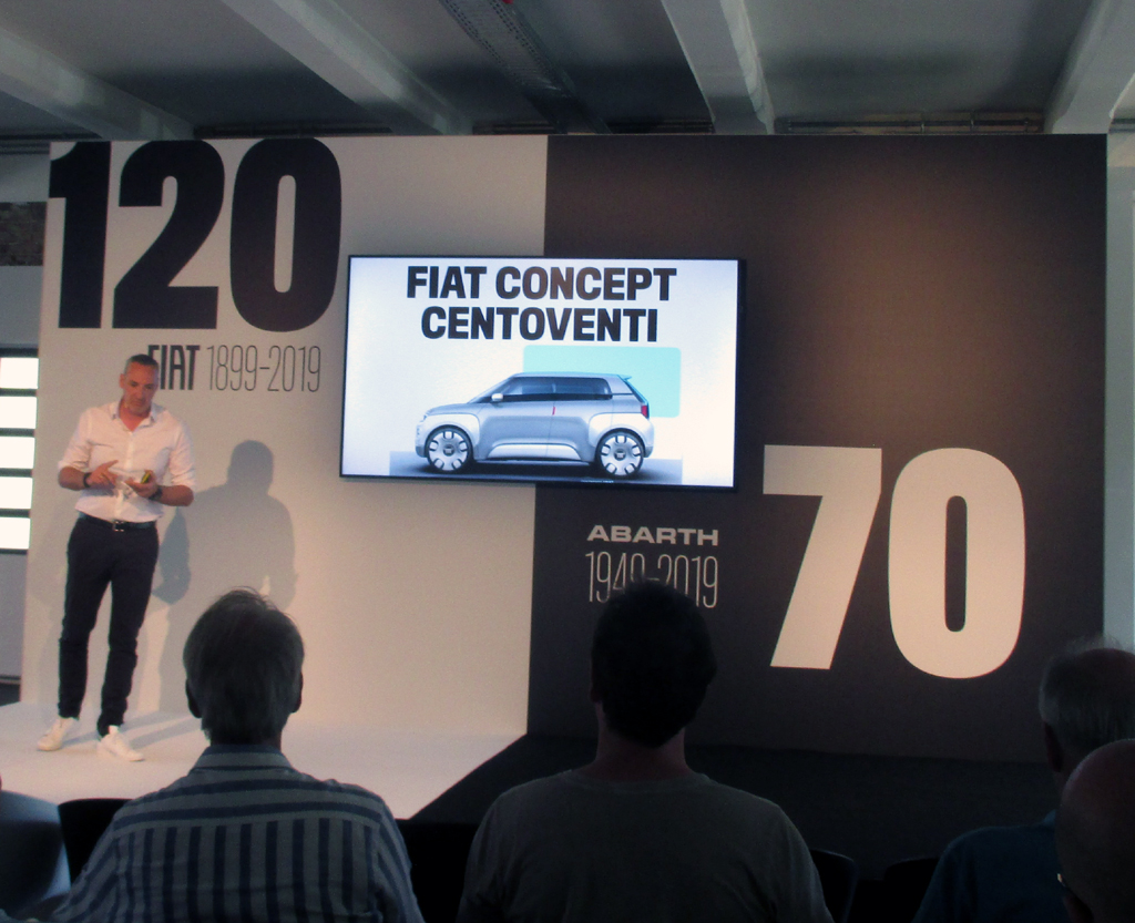 Wo das Unternehmen freilich selbst im Jubeljahr noch Nachholbedarf hat, dürfte die Elektrifizierung sein, die mit den ersten Jeep-Modellen Renegade und Compass als Plug-in-Hybrid wohl 2020 beginnt. Bei der Veranstaltung in Frankfurt hat Fiat-Chrysler-Automobiles-Deutschland-Sprecher Sascha Wolfinger immerhin das schon beim Autosalon zuletzt in Genf gezeigte Fiat-Konzeptfahrzeug Centoventi (für die Fiat-Jubiläumszahl 120) noch einmal vorgestellt, ein Elektro-Kleinwagen, den man selbst konfigurieren, Accessoires auswählen und ihn nach eigenen Bedürfnissen gestalten kann.