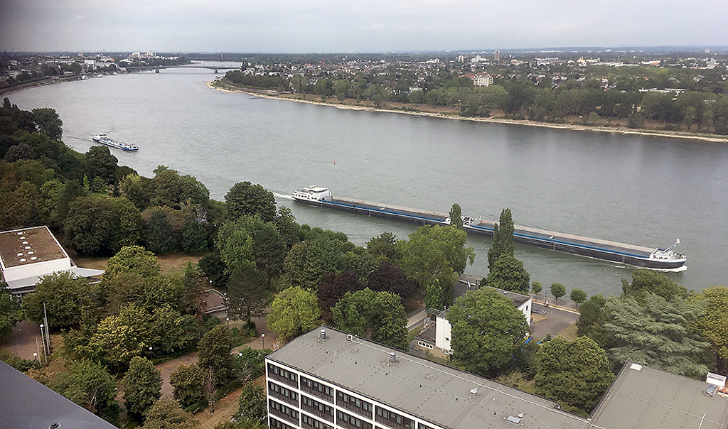 In Bonn: Die Navigation zeigt im Mini-Zentraldisplay den Weg. Der Rhein nahe der früheren Bundeshauptstadt.